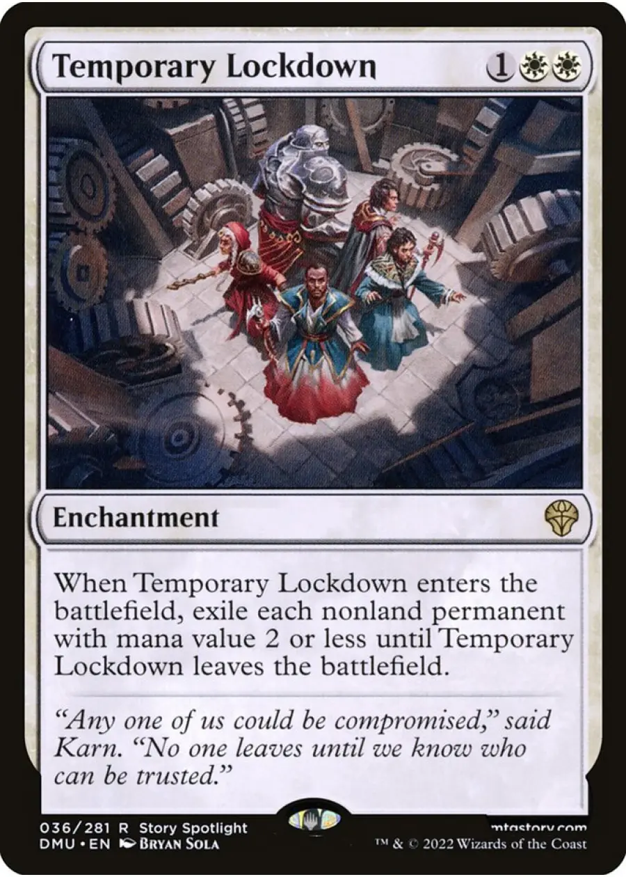 - When this enchantment enters, exile each nonland permanent with mana value 2 or less until this enchantment leaves the battlefield.
