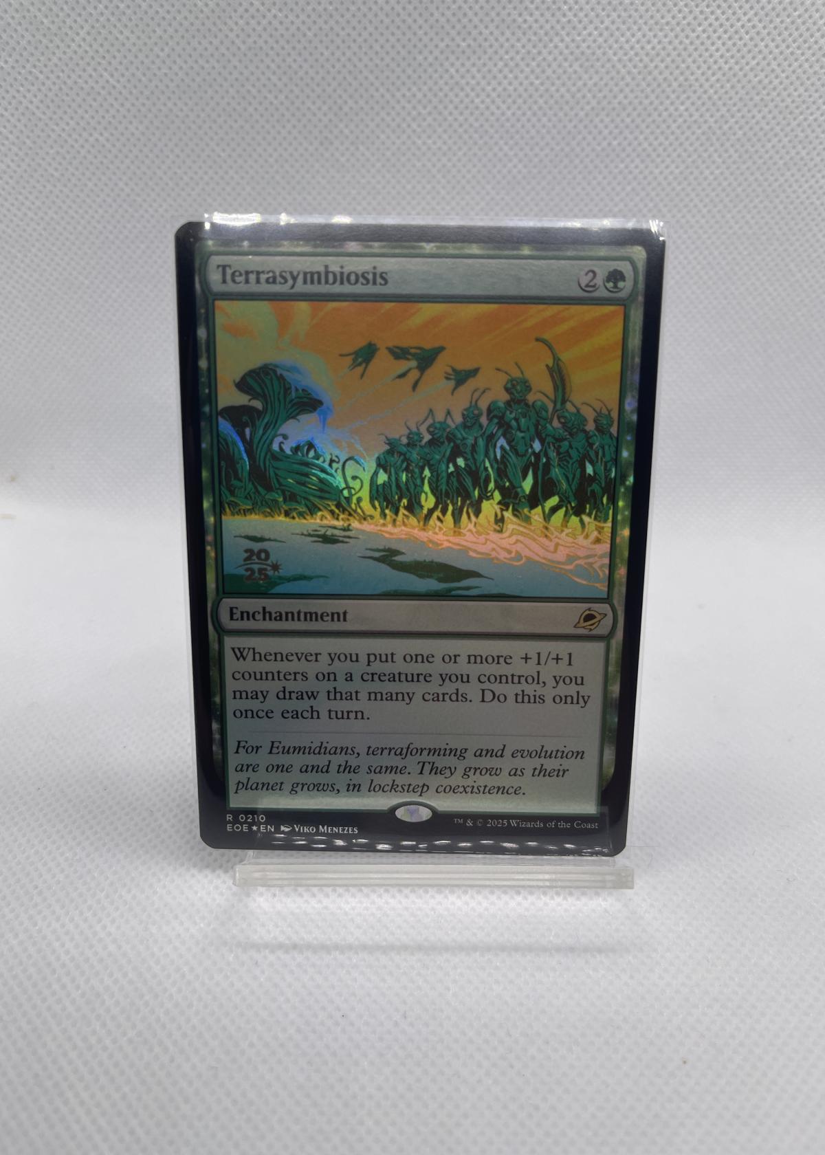 Terrasymbiosis is a Magic: The Gathering enchantment card illustrated by Viko Menezes, from the set with code EOE. This is a foil version, as indicated by the card's appearance. Its effect revolves around drawing cards when putting +1/+1 counters on your creatures, which may be effective in specific counter-focused decks and can be playable in meta, not just collectible. The card's unique art and foiling treatment increase its appeal. Released in 2025, this copy is in English.