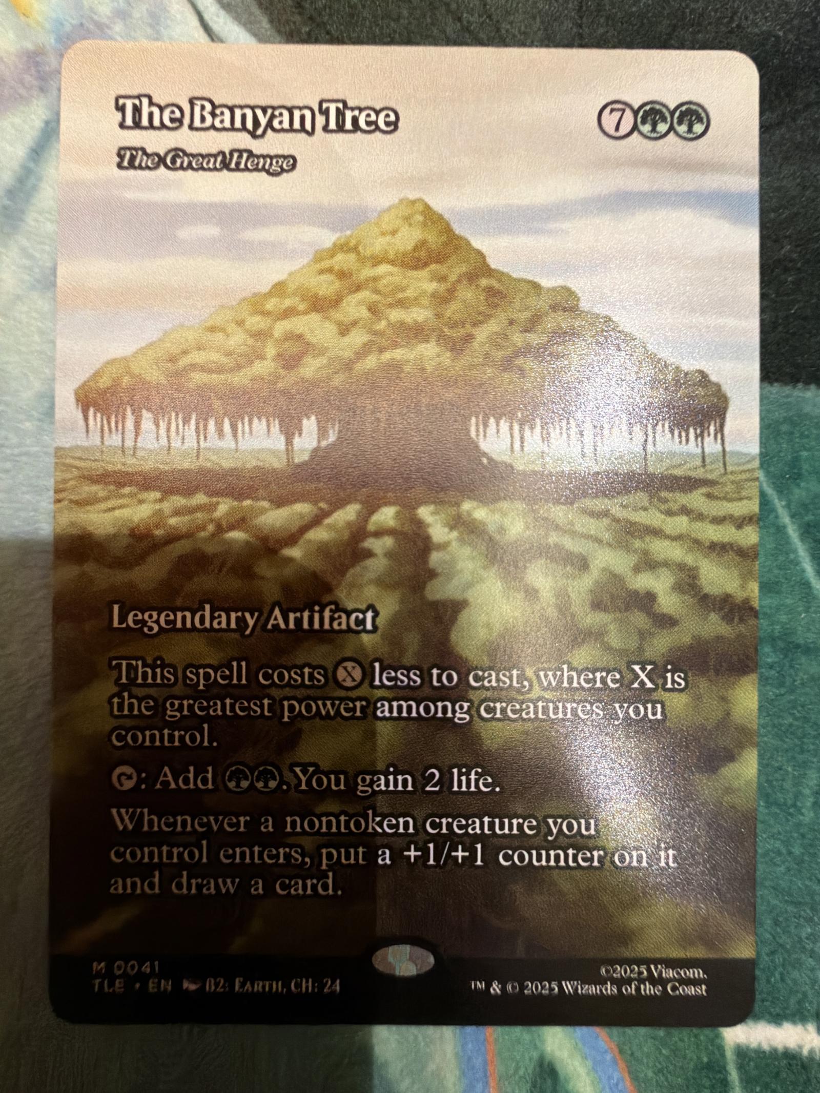 The Banyan Tree is a legendary artifact card from The Great Henge set released in 2025. The card costs 7GG and has abilities related to casting cost reduction, life gain, and putting +1/+1 counters on creatures. It is playable in the meta as it supports creature-based decks by drawing cards and enhancing creatures. The card is in English and has a normal printing treatment. The artist name is not visible in the provided image.