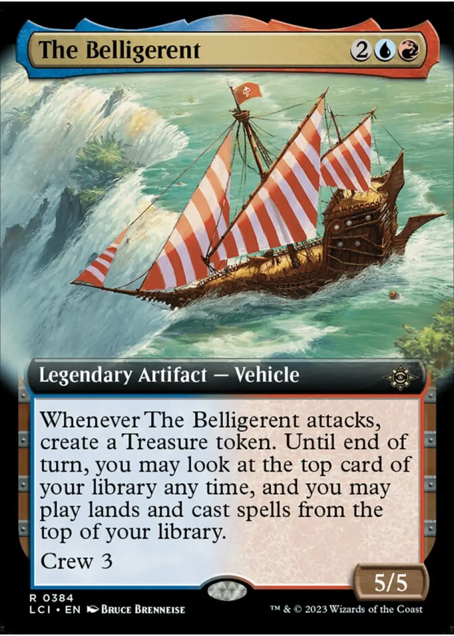 Whenever The Belligerent attacks, create a Treasure token. Until end of turn, you may look at the top card of your library any time, and you may play lands and cast spells from the top of your library.