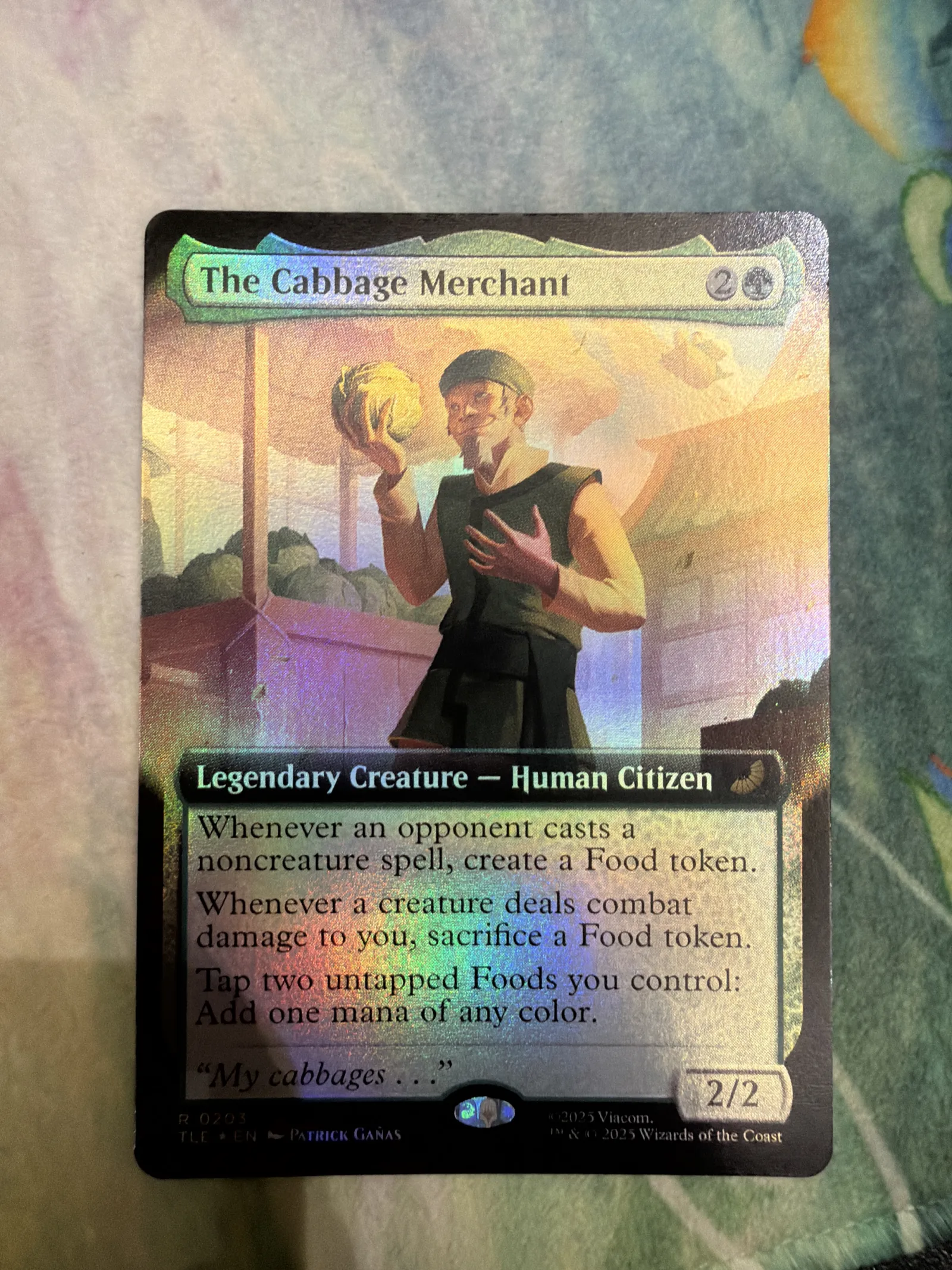 The Cabbage Merchant is a legendary creature card from the Magic 2025 set, illustrated by Vincom. This foil version adds a shimmering finish, enhancing its collectible appeal. The card's unique ability to generate Food tokens makes it potentially playable in niche decks or casual play. It is a rare and visually striking addition for collectors and players alike.
