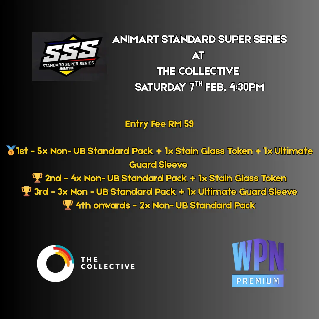 📅 Date: Saturday, 7th February 2026 ⏰ Event Start Time: 4:30PM 💰 Entry Fee: RM 59 🎭 Format: Standard 🥇1st - 5x Non- UB Standard Pack + 1x Stain Glass Token + 1x Ultimate Guard Sleeve 🏆 2nd - 4x Non- UB Standard Pack + 1x Stain Glass Token 🏆 3rd - 3x Non - UB Standard Pack + 1x Ultimate Guard Sleeve 🏆 4th onwards - 2x Non- UB Standard Pack