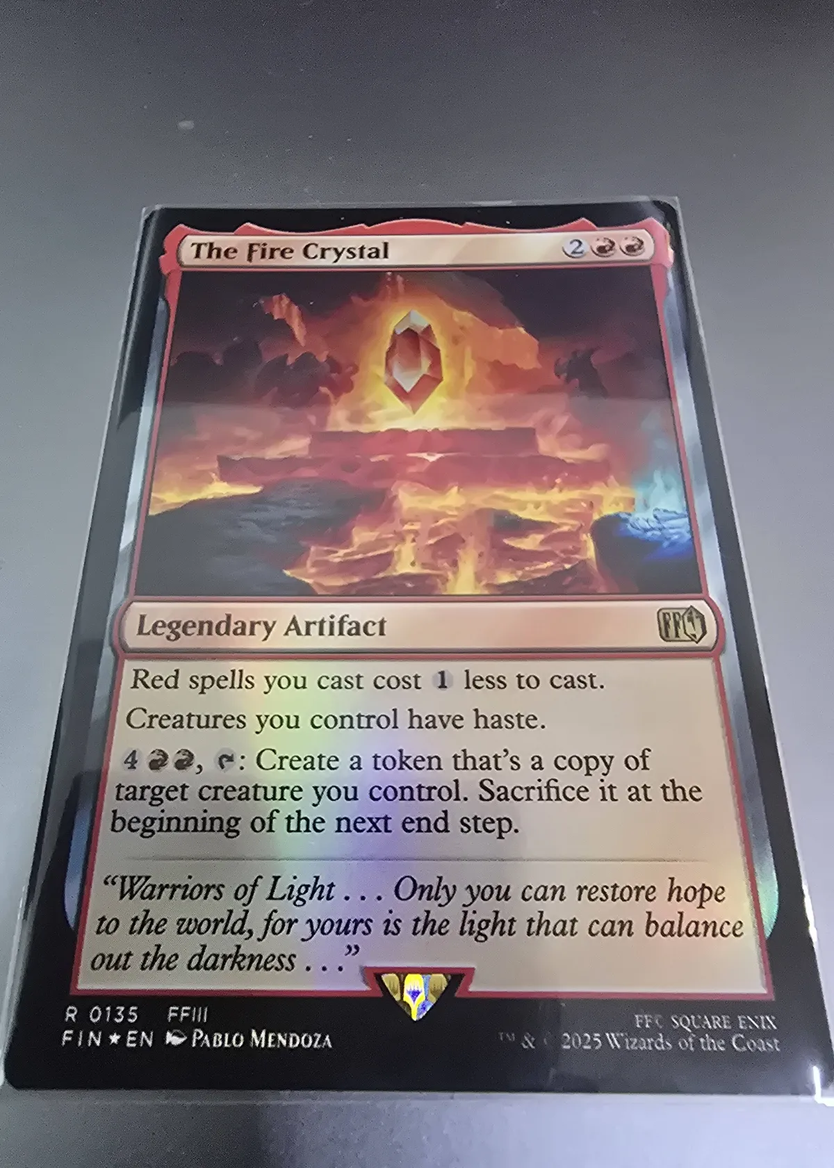 Legendary Artifact card from Magic: The Gathering. Card text: Red spells you cast cost 1 less to cast. Creatures you control have haste. Ability: 4 red, 2 colorless, tap: Create a token that's a copy of target creature you control. Sacrifice it at the beginning of the next end step. Artist: Philip Mendoza. Set code: FFI. This card appears to be a custom or proxy card and is not part of the official Magic: The Gathering metagame, making it collectible but not tournament-playable. Not foil.