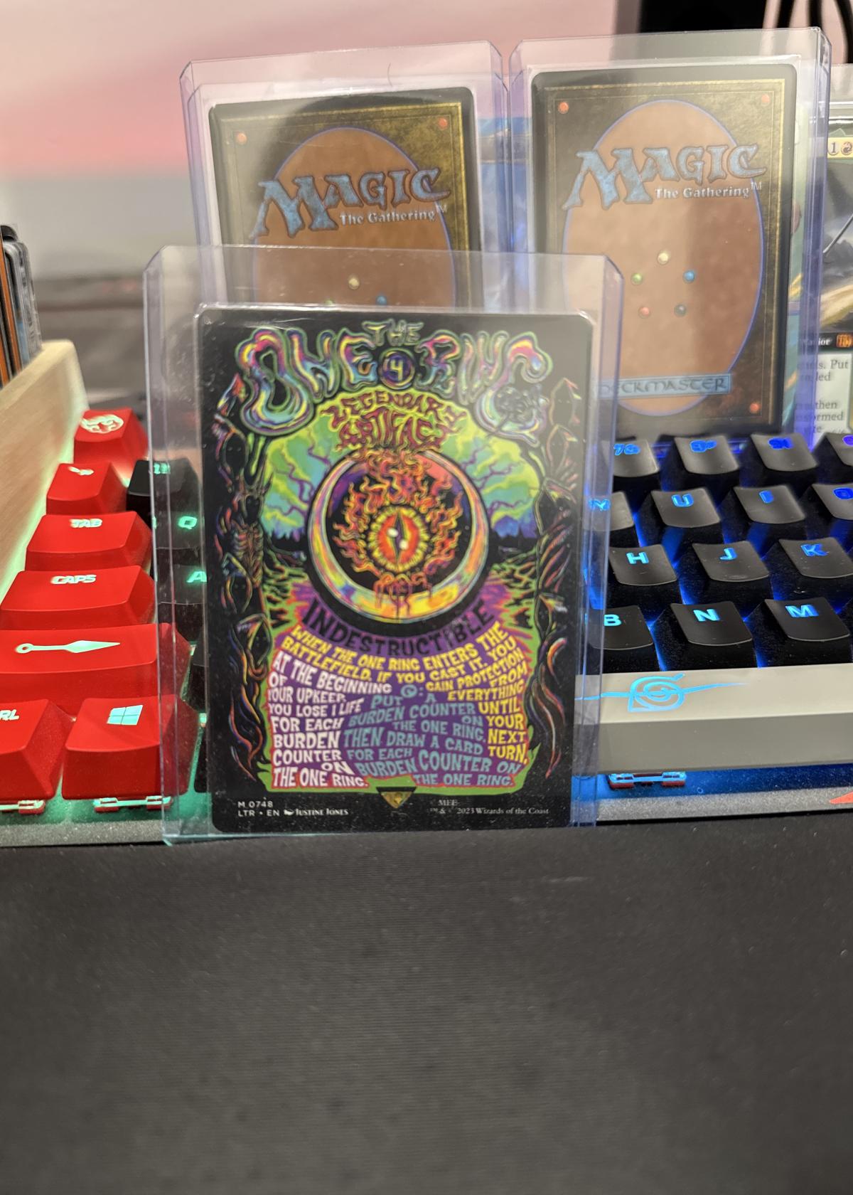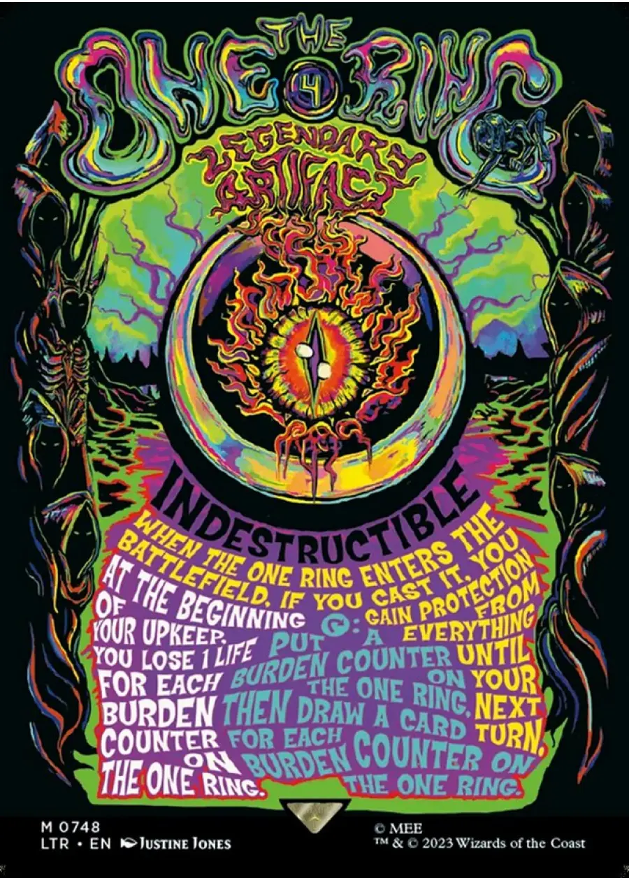 This is The One Ring, a Legendary Artifact card from Magic: The Gathering's The Lord of the Rings: Tales of Middle-earth (LTR) set. This particular printing features psychedelic, alternate art by artist Justin Jones. It is card number 748 in the set and is in English (EN). The card appears to be foil, as indicated by the special art border and treatment. The One Ring is both collectible and highly playable in competitive Magic formats, serving as a key draw engine and protective piece in various decks. A standout for collectors due to its unique art and premium treatment.