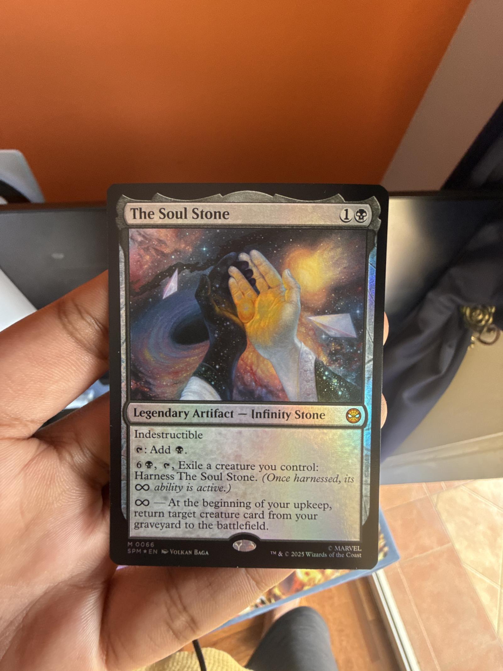 The Soul Stone is a Legendary Artifact - Infinity Stone from the Secret Lair Marvel set of Magic The Gathering. Illustrated by Volkan Baga, this is a foil card with indestructible and harness abilities. It is a collectible card with some playability in casual formats due to its unique effect of returning creatures from the graveyard. This card is in English language and is not graded.