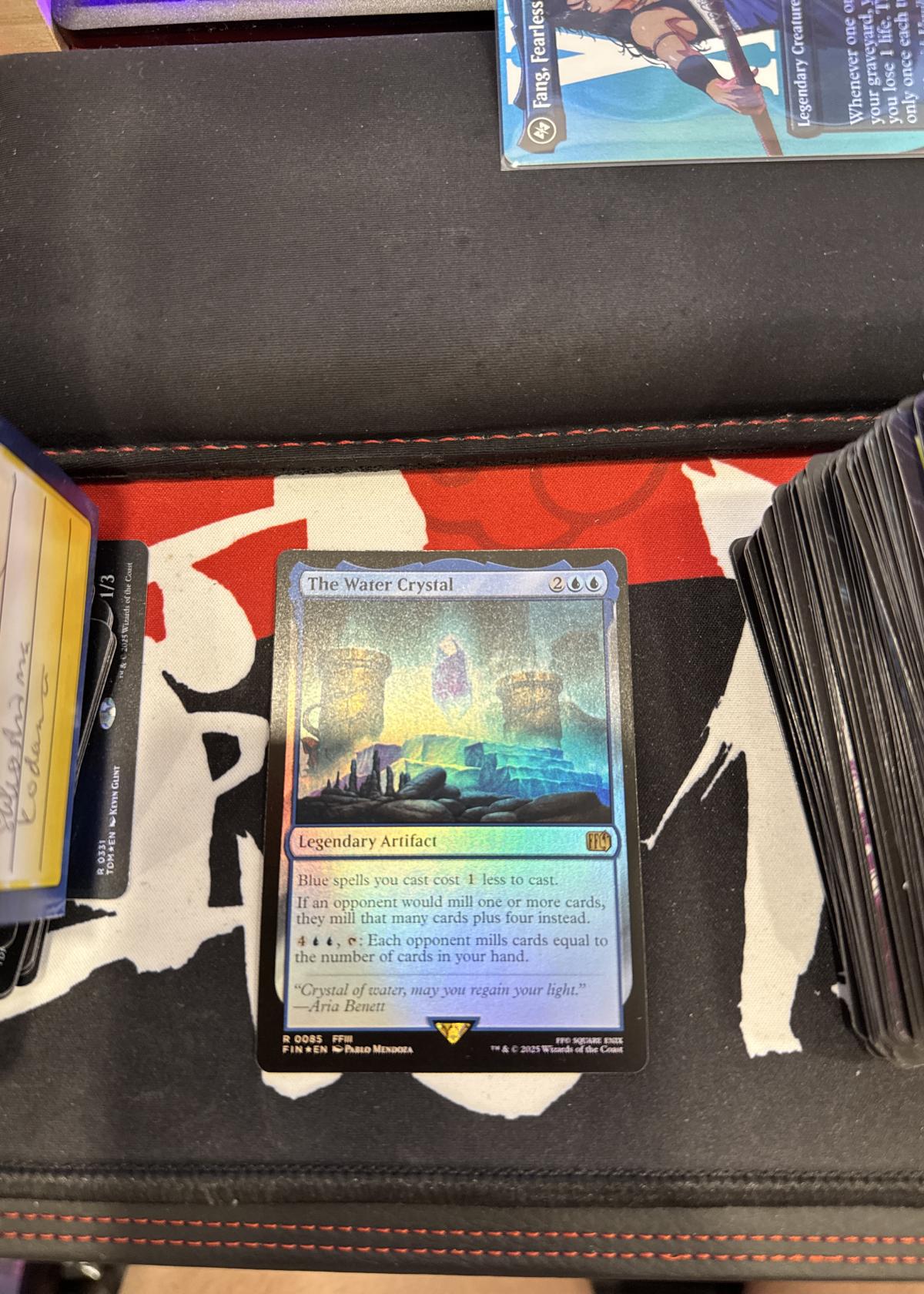 The Water Crystal provides a powerful synergy for mill decks by reducing the cost of blue spells by one and amplifying your milling effects—forcing opponents to mill additional cards. Its unique mechanics and thematic flavor text referencing Final Fantasy make it a standout collectible for fans of both franchises. As a Secret Lair drop, it holds special appeal for collectors and players in formats allowing custom cards, though it is not universally tournament-legal.