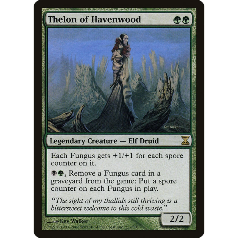 Thelon of Havenwood, a Legendary Elf Druid creature card illustrated by Kev Walker from the 2006 set. Card number 227/301. This card is non-foil and can be used in decks focusing on Fungus token strategies. Vintage collectible with notable mechanics involving spore counters.