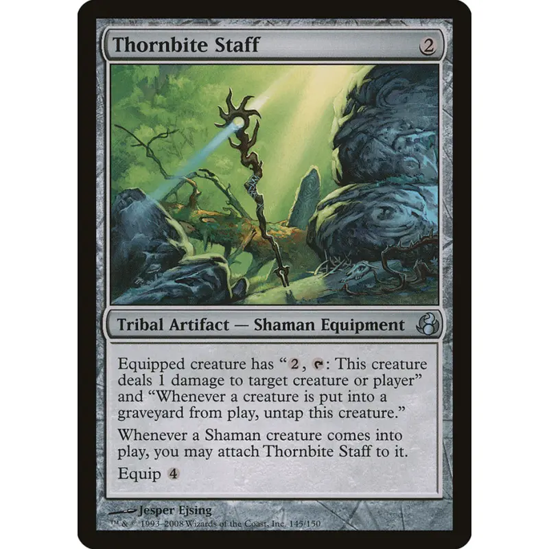 Thornbite Staff from the Morningtide set. Artist: Jesper Ejsing. Card number 145/150. This is a normal printing, playable in various formats as a useful artifact equipment for Shaman tribal decks.
