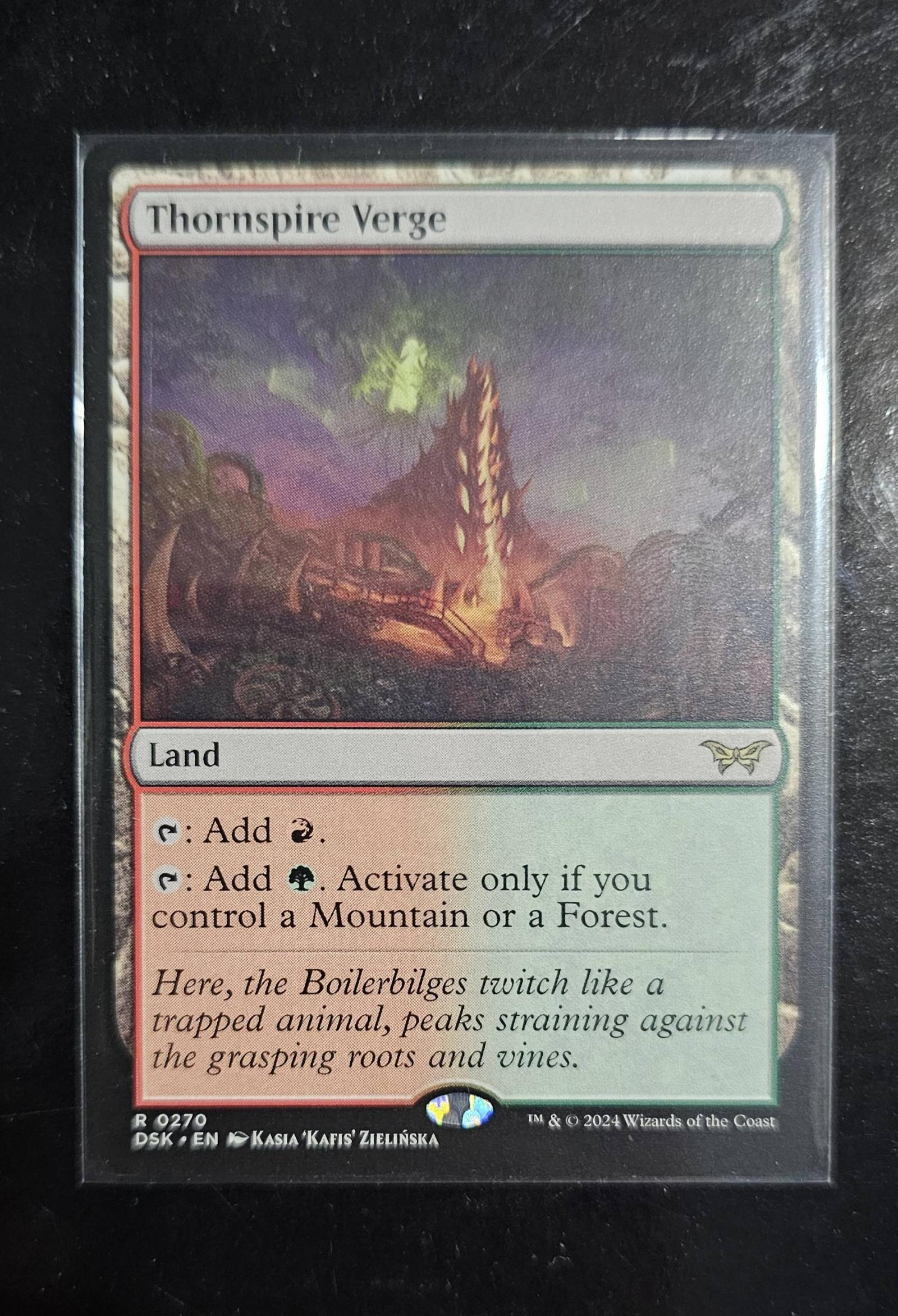 Thornspire Verge is a land card from the Duskmourn: House of Horror (DSK) set, illustrated by Kasia 'Kafis' Zielińska. This card is in English, and has a normal printing. Useful for decks needing both red and green mana, it activates additional mana generation if you control a Mountain or a Forest. It is playable in various formats and offers strategic mana options.