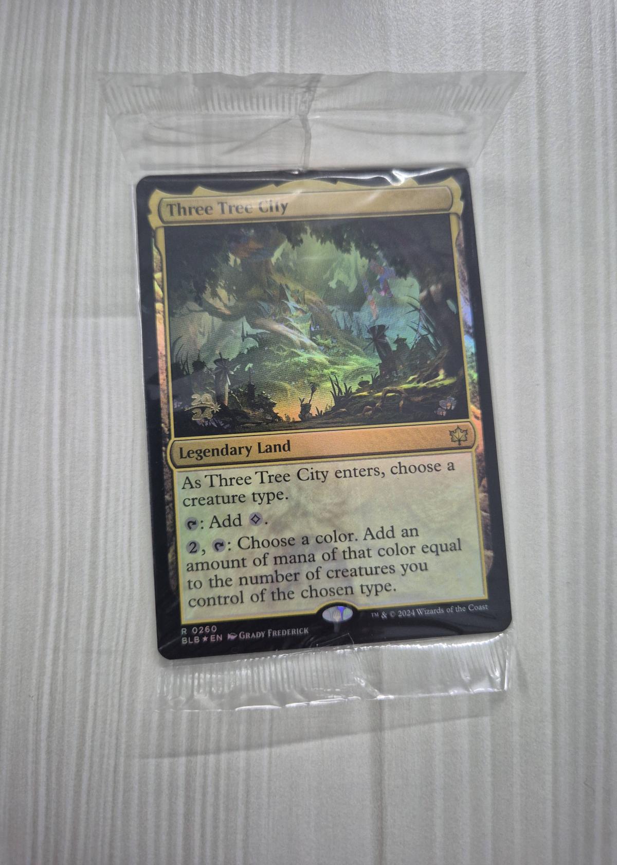 Three Tree City is a Legendary Land card from the Magic: The Gathering set 'Bloomburrow'. The collector number is 260 and the card's set code is 'BLB', with the English language code 'EN'. This foil card features artwork by Grady Frederick. As a land that offers both colorless mana and a unique mana ramp ability based on your chosen creature type, it can be quite useful in tribal or creature-heavy decks, making it playable in meta as well as collectible. Its foil treatment and sealed packaging add to its appeal for both players and collectors.