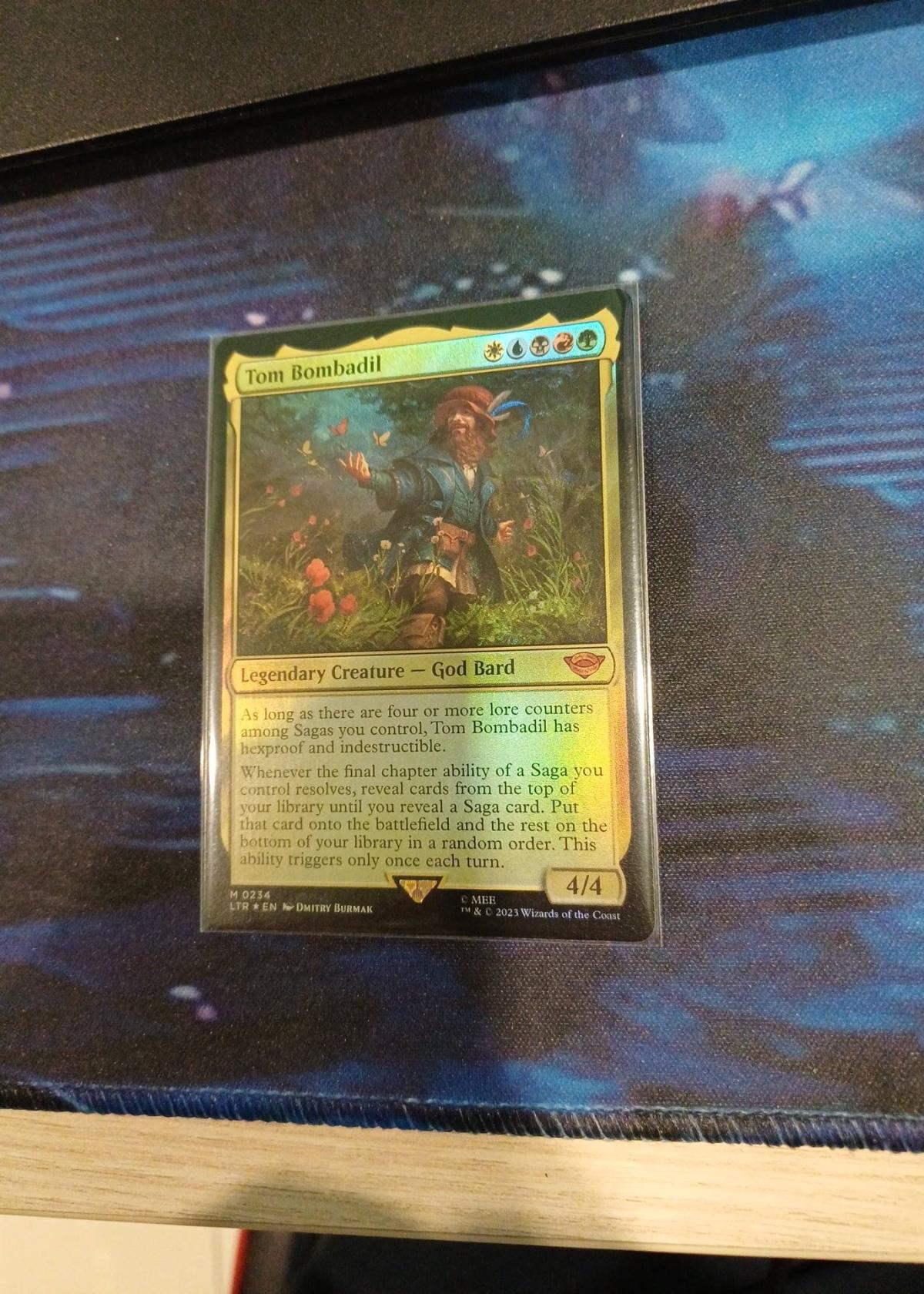 Tom Bombadil is a Legendary Creature – God Bard from the The Lord of the Rings: Tales of Middle-earth set, with artwork by Dmitry Burmak. This card is printed in foil and has collector number 234. Tom Bombadil is highly playable in Commander decks focused on Sagas, offering powerful synergy with Saga cards. The card is in English and is part of the LTR set.