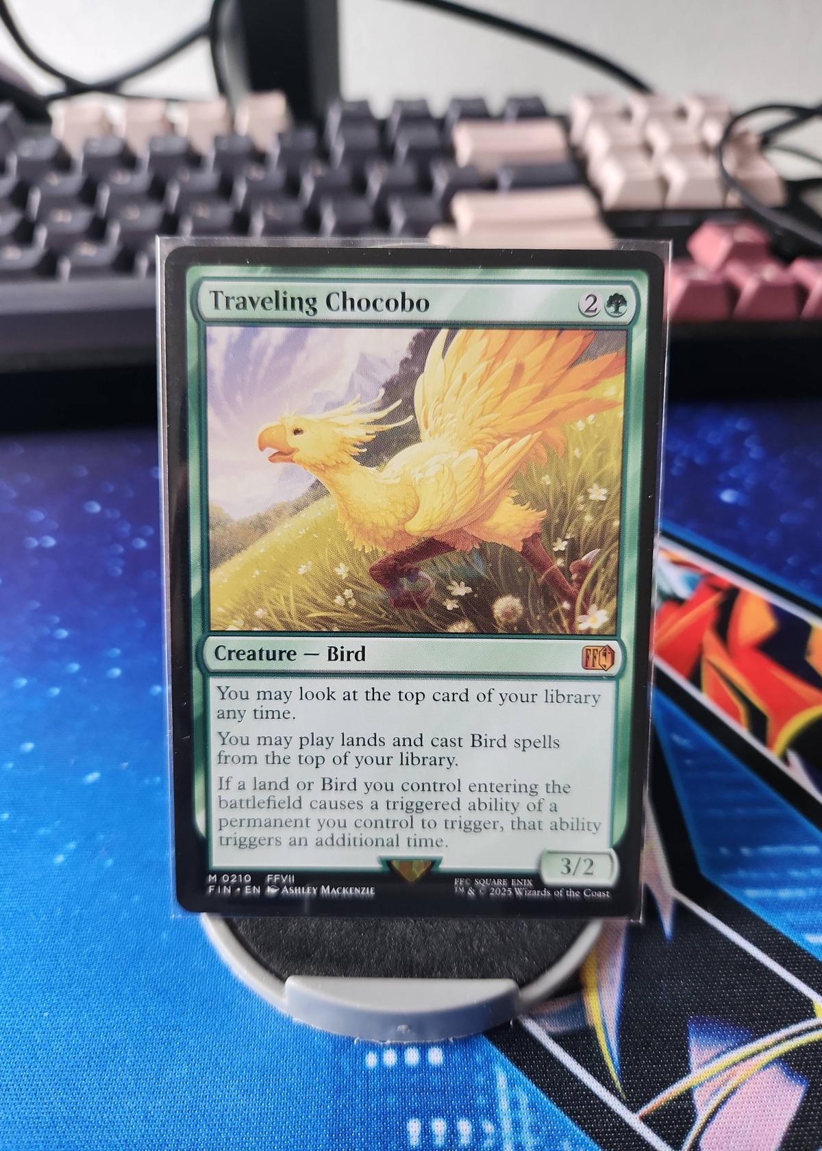 Traveling Chocobo is a green creature card (Bird) from the Magic: The Gathering set coded FFVII, illustrated by Ashley Mackenzie. This card features synergy with Bird spells and landfall mechanics, making it interesting for decks focused on those themes. The treatment appears to be normal (not foil). This is an English card, card number 210. Governed by its triggered ability enhancement, this card is more likely to be a fun collectible or used in casual settings than in high-tier competitive play. Set: FFVII, 2025 Wizards of the Coast.