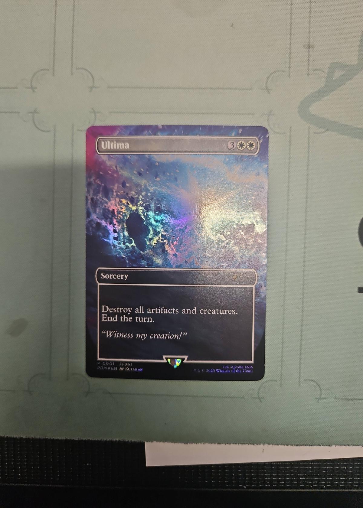 Ultima is a limited edition promo card from the Magic: The Gathering x Final Fantasy XVI crossover, with card number P1 and set code FFXVI. This foil card features artwork by KOTAKM and is printed in English. As a promo sorcery card that destroys all artifacts and creatures and ends the turn, it is more of a collectible item due to its unique crossover origin than a meta staple. Licensed by Square Enix and Wizards of the Coast, this is a special item for collectors and Final Fantasy fans.