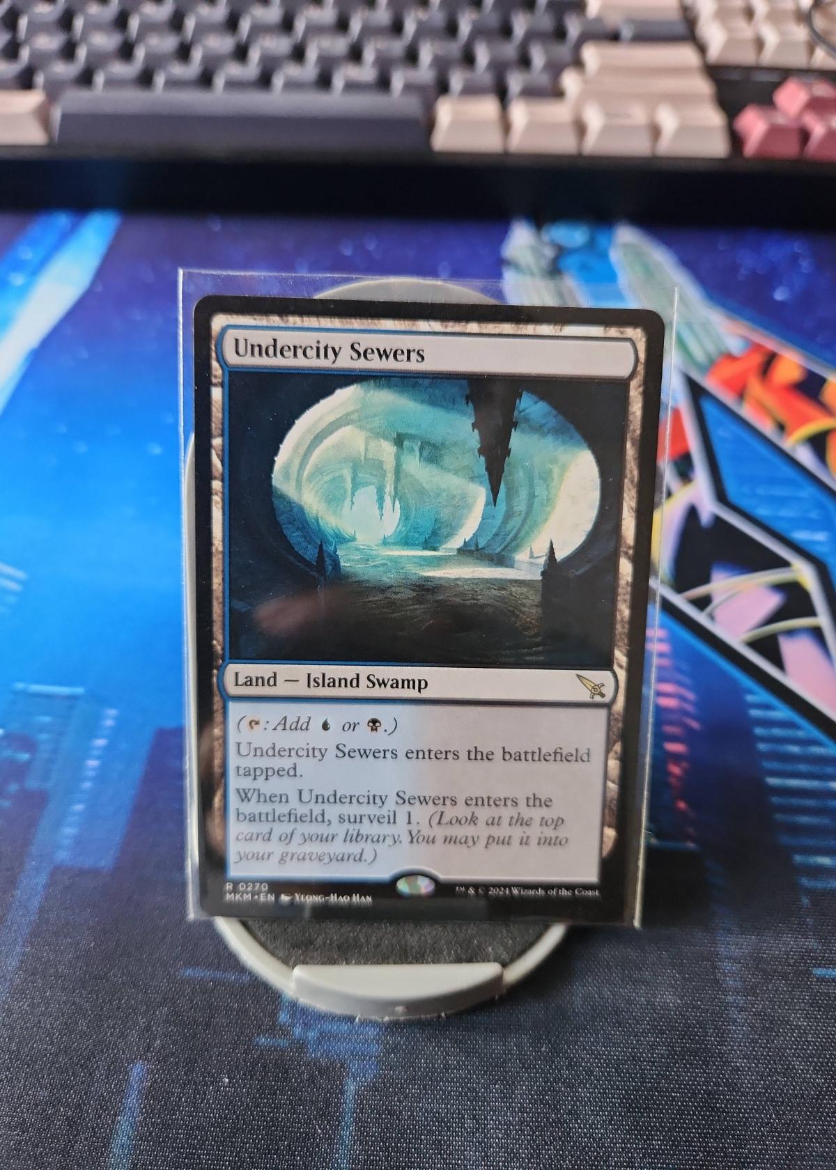 Undercity Sewers is a land card (Island Swamp) from the Magic: The Gathering set 'Murders at Karlov Manor' (MKM), illustrated by Yeng-Hao Han. This card enters the battlefield tapped and allows you to surveil 1 when it enters the battlefield. It is a useful two-color land for blue/black (Dimir) decks, especially in Standard and Limited formats. This version appears to be a regular, non-foil printing.
