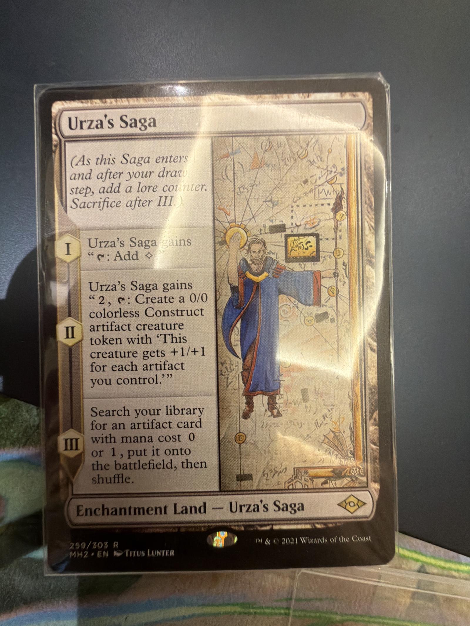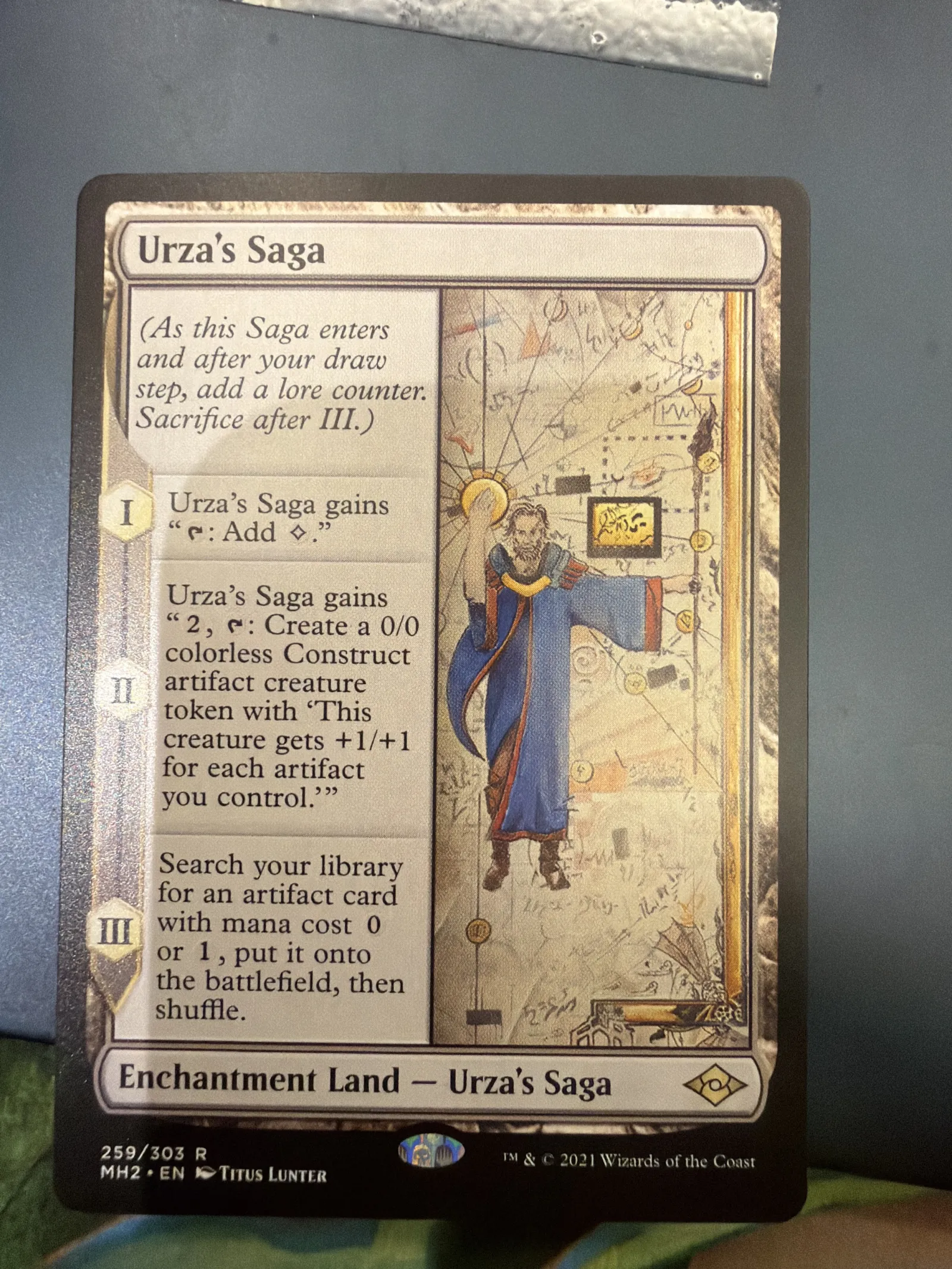 Urza's Saga from Modern Horizons 2, illustrated by Titus Lunter. This rare enchantment land card is playable in many artifact and control decks in the current meta. The card is non-foil and in English. Collector number 250 from a set of 303 cards.