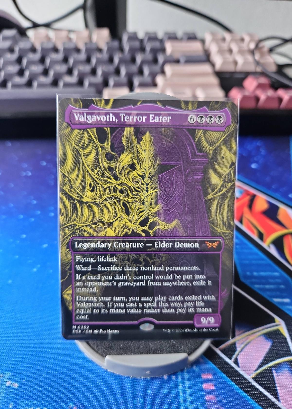 Valgavoth, Terror Eater is a Legendary Creature – Elder Demon from the Magic: The Gathering set 'Duskmourn: House of Horror.' This card features abilities such as Flying, lifelink, and a powerful Ward that requires opponents to sacrifice three nonland permanents. It supports graveyard exile plays and allows casting exiled cards for life instead of mana. The card's artist is Pig Hands. Its stats (9/9) and abilities make it potentially strong in Commander or casual formats, though not currently a meta staple. This is a normal (non-foil) printing.
