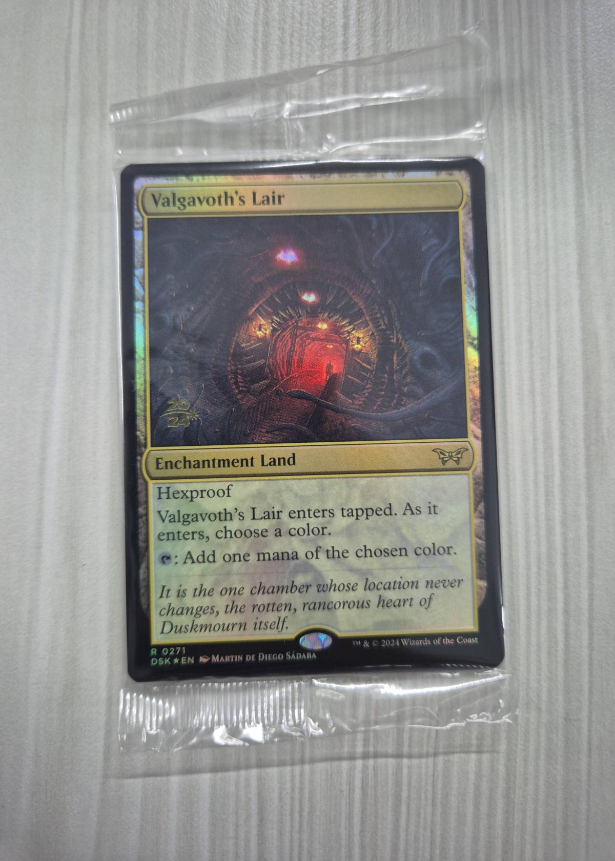 Valgavoth's Lair is a rare Enchantment Land card illustrated by Martin de Diego Sádaba from the Duskmourn: House of Horror set (DSK). This card features a beautiful foil treatment and enters tapped, offering hexproof. Upon entering the battlefield, you choose a color and it can tap to add one mana of that color. The card is in English. It is both collectible and potentially playable depending on future meta, especially in formats that allow newly released sets. The card is sealed and in mint condition.