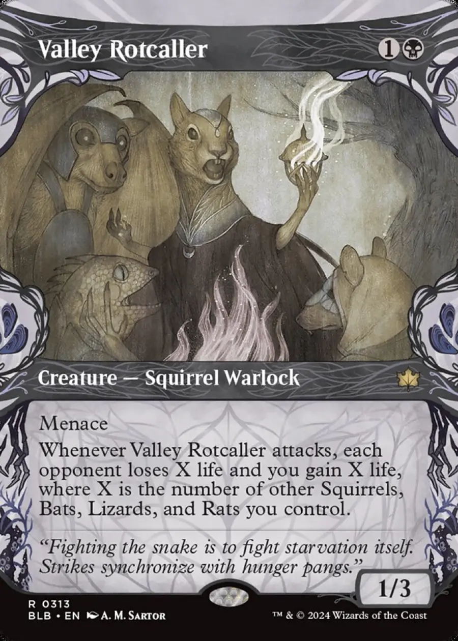Whenever Valley Rotcaller attacks, each opponent loses X life and you gain X life, where X is the number of other Squirrels, Bats, Lizards, and Rats you control. - Flavor Text