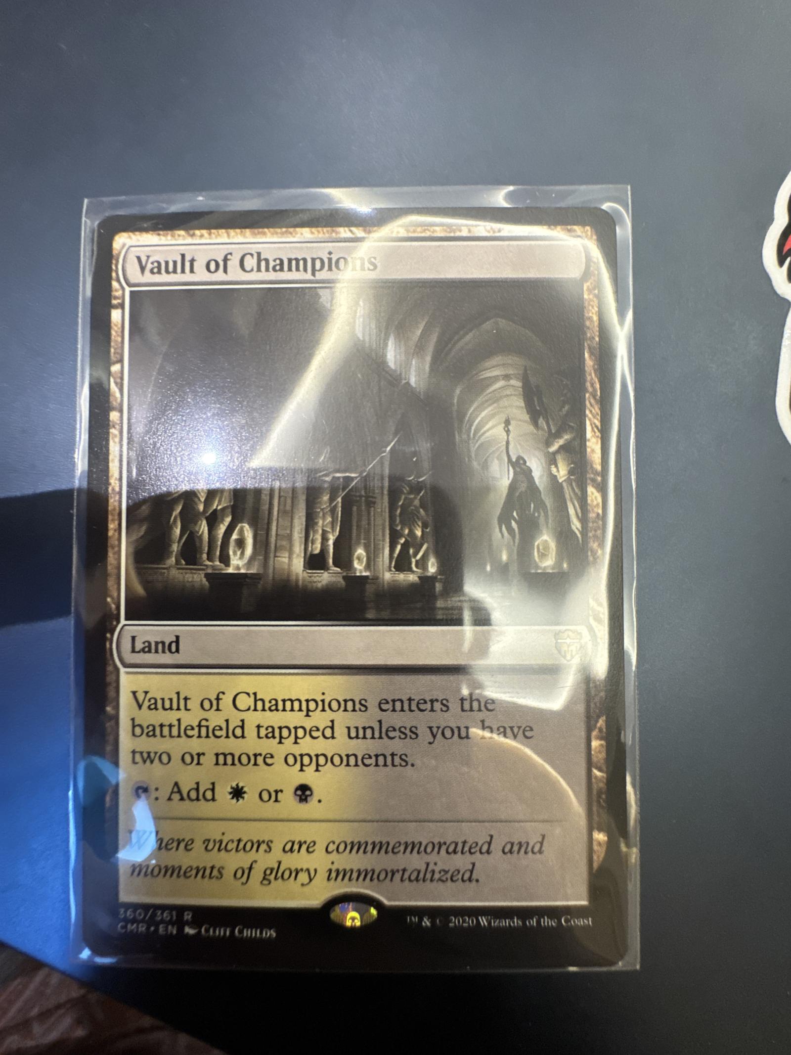 Vault of Champions is a land card from the set Commander Legends (CMR). The card features art by Cliff Childs. This card is non-foil and is playable in multiplayer Commander formats where it can be strategically valuable for mana fixing.