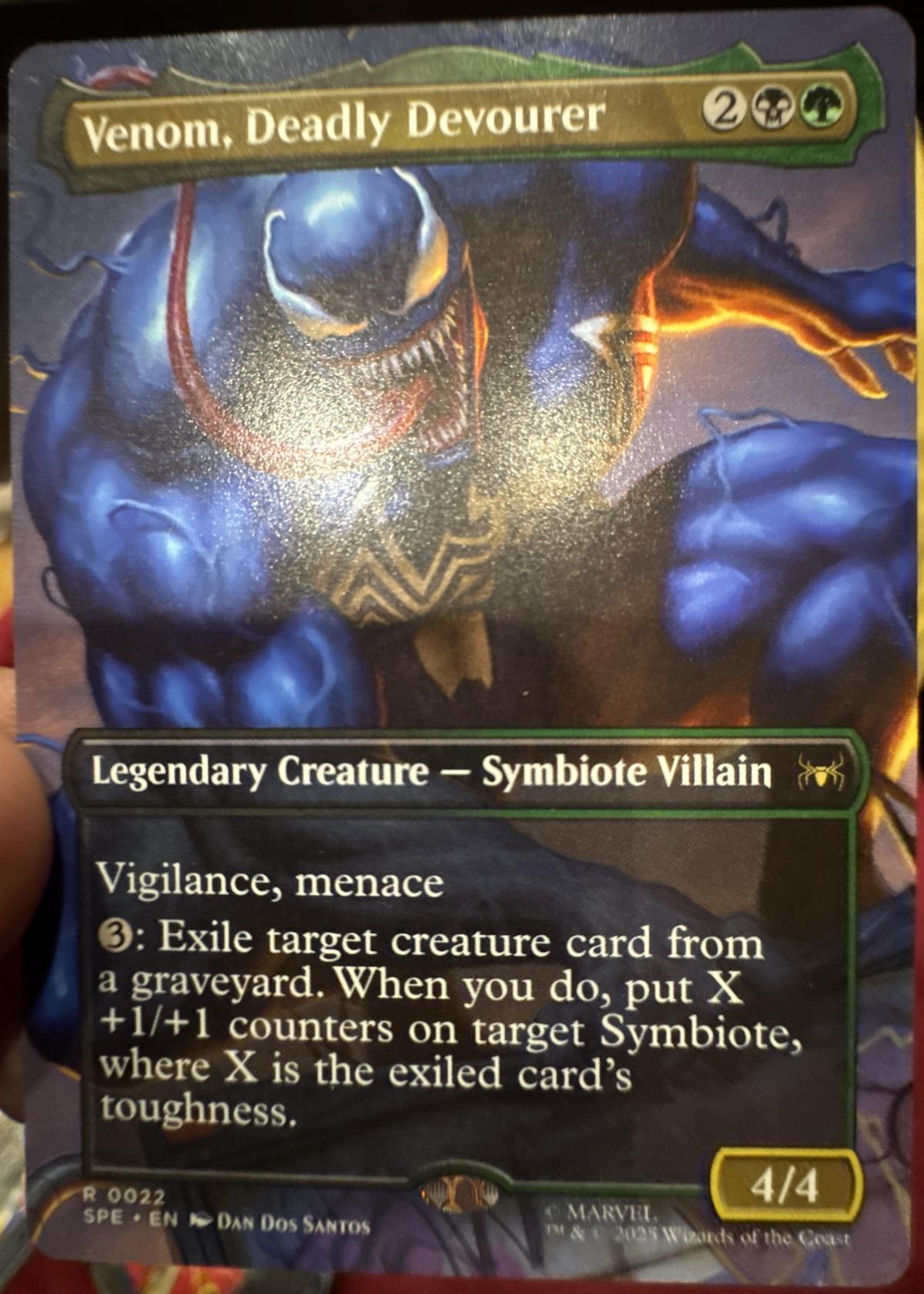 Venom, Deadly Devourer is a legendary creature card from the Magic: The Gathering Universes Beyond: Marvel set. Art by Dan Dos Santos. This card features vigilance and menace, with an activated ability to exile creature cards and distribute +1/+1 counters. It is a rare card (R 0022) from the SPE set and is printed in English. The card has a normal, non-foil treatment and is suitable for play in casual formats, making it both collectible and playable for fans of Magic and Marvel. Card set code: SPE.