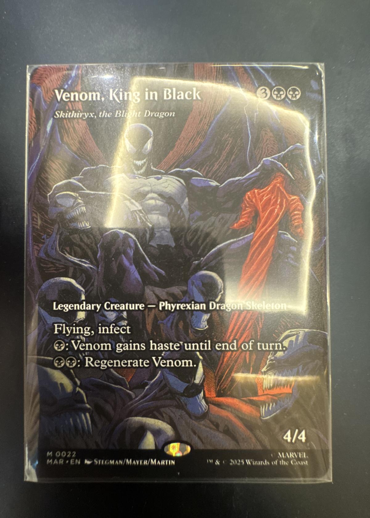 Venom, King in Black is a special Magic: The Gathering card featuring Skithiryx, the Blight Dragon with Marvel-themed artwork by Stegman, Mayer, and Martin. This card, numbered M0022 from the MAR set, is printed in English and has a non foil treatment. It showcases the iconic character Venom as a Legendary Creature – Phyrexian Dragon Skeleton, with abilities such as flying, infect, haste, and regeneration. This card is both collectible due to its unique art crossover and potentially playable in Commander formats. Released in 2025 by Wizards of the Coast and Marvel.