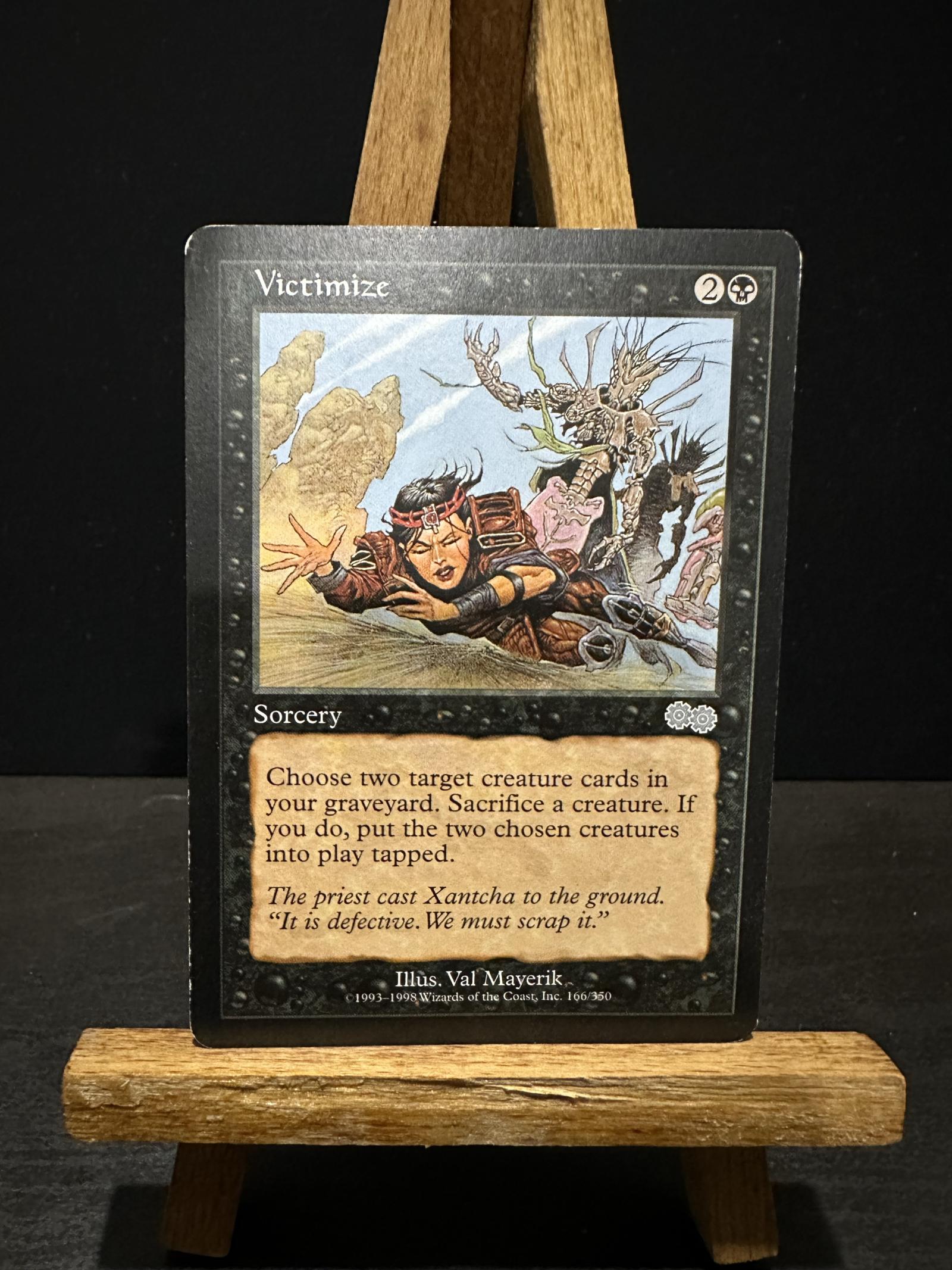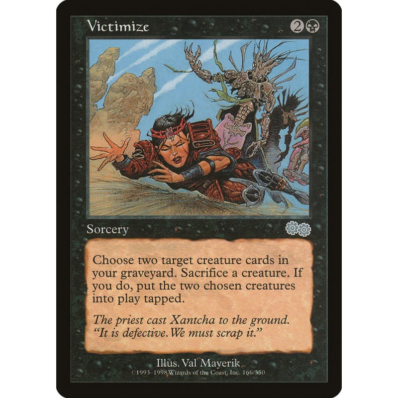 Victimize from the Tempest set, illustrated by Val Mayerik. This card allows you to choose two target creature cards in your graveyard and sacrifice a creature to put the chosen creatures into play tapped. The card is non-foil and playable in many black graveyard decks. Card number 166 out of 350.