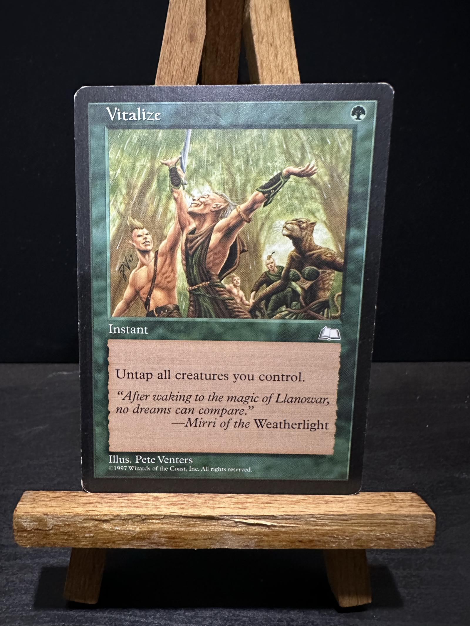 Vitalize, illustrated by Pete Venters, is a green instant card from the Alpha set (1997). This card untaps all creatures you control, which is useful in various gameplay scenarios. It is a non-foil collectible card that holds nostalgia value and potential playability in casual formats. The card is in English.