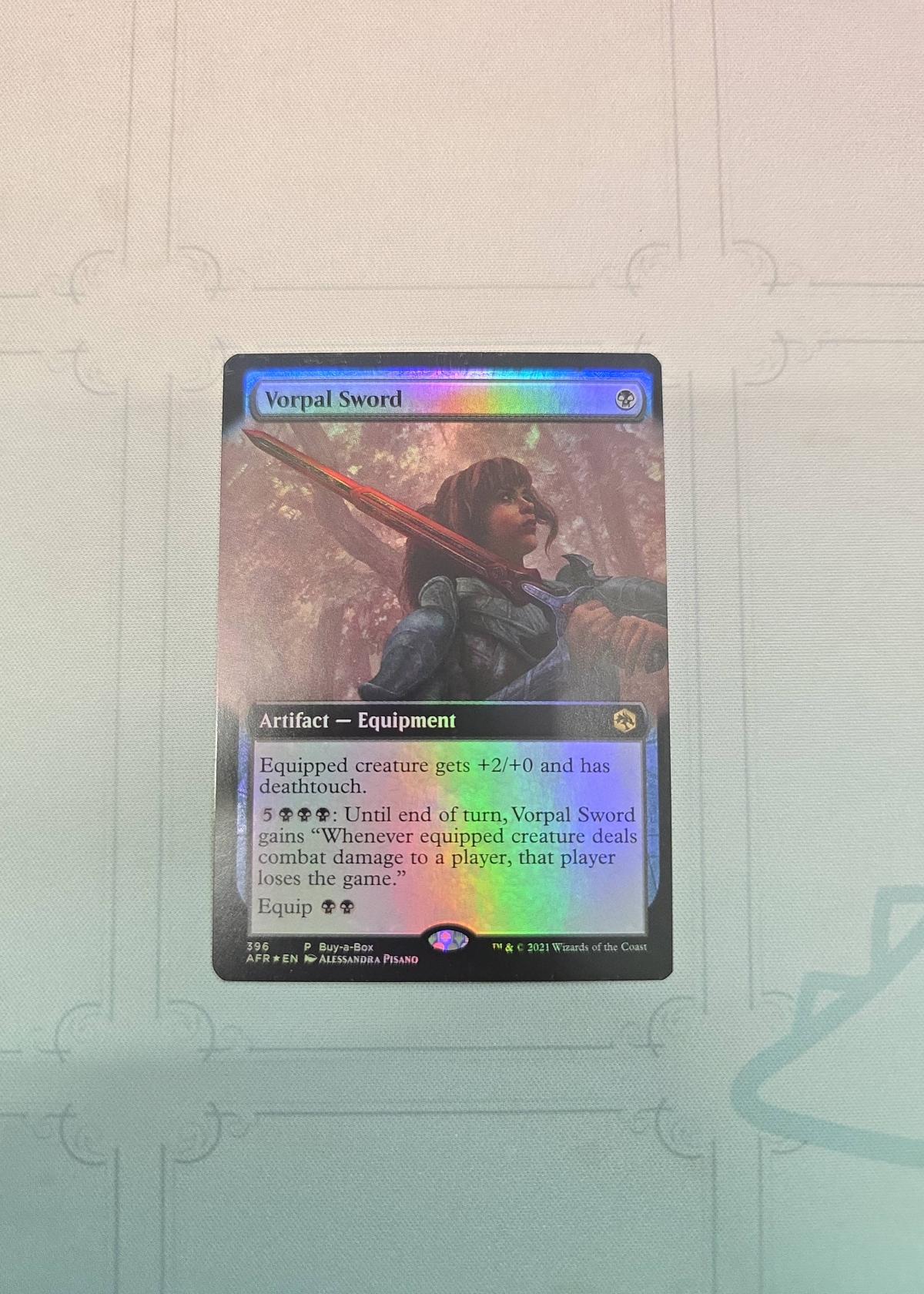 Vorpal Sword is a Buy-a-Box promotional foil card from Adventures in the Forgotten Realms (AFR), illustrated by Alessandra Pisano. This artifact equipment gives a creature +2/+0 and deathtouch, with a game-ending activated ability. Mostly collectible due to its promo nature, but also playable in Standard, Commander, and other formats. Includes foil finish and exclusive promo stamp.