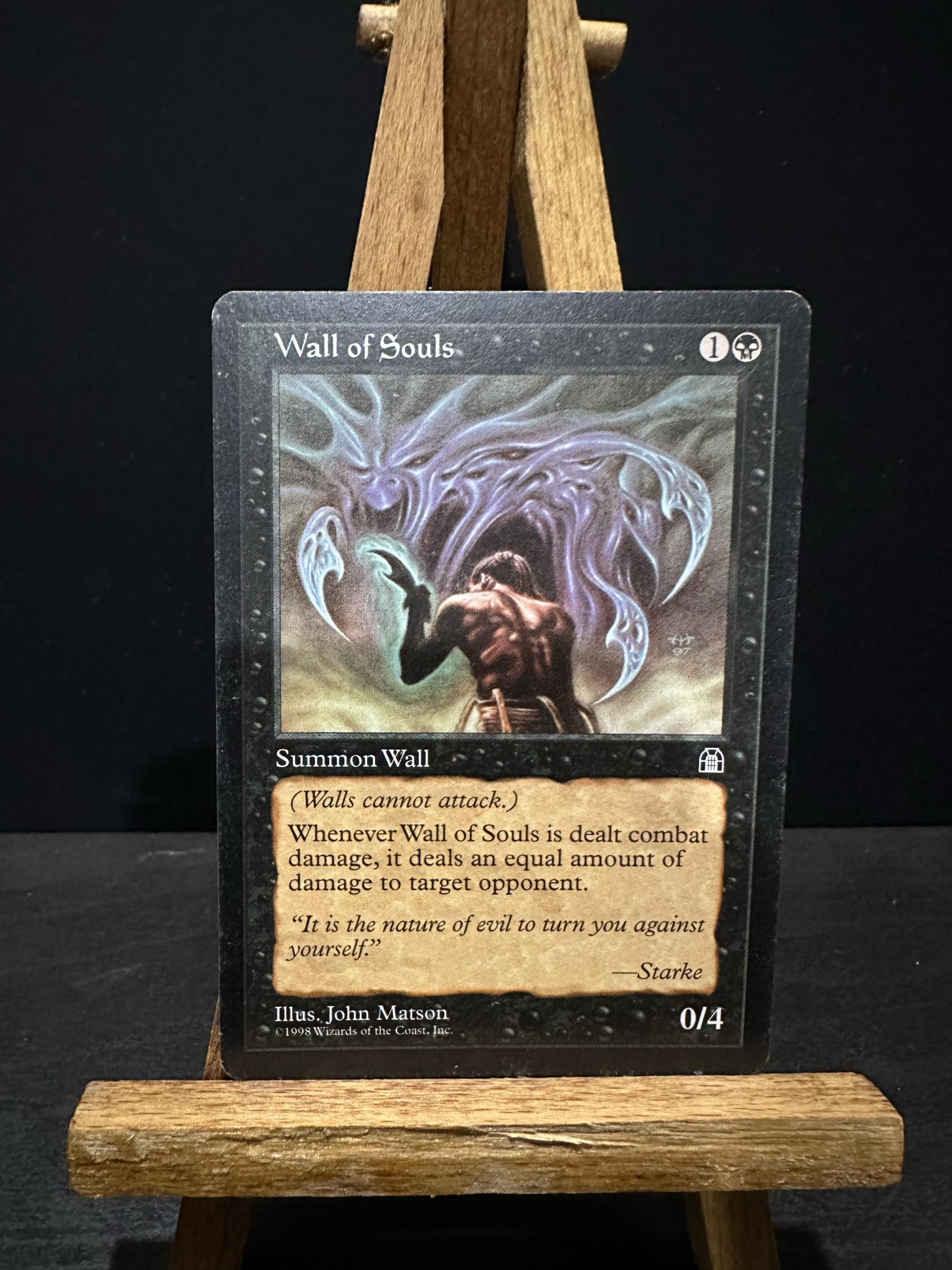 Wall of Souls from the 1998 Magic: The Gathering set 'Torment'. Illustrated by John Matson. This is a non-foil collectible card featuring a solid defensive wall with 0/4 stats. The card is playable in black defensive strategies but not often seen in top meta decks. The card text deals damage equal to the damage dealt to it back to an opponent. Set code is TOR. Language is English.