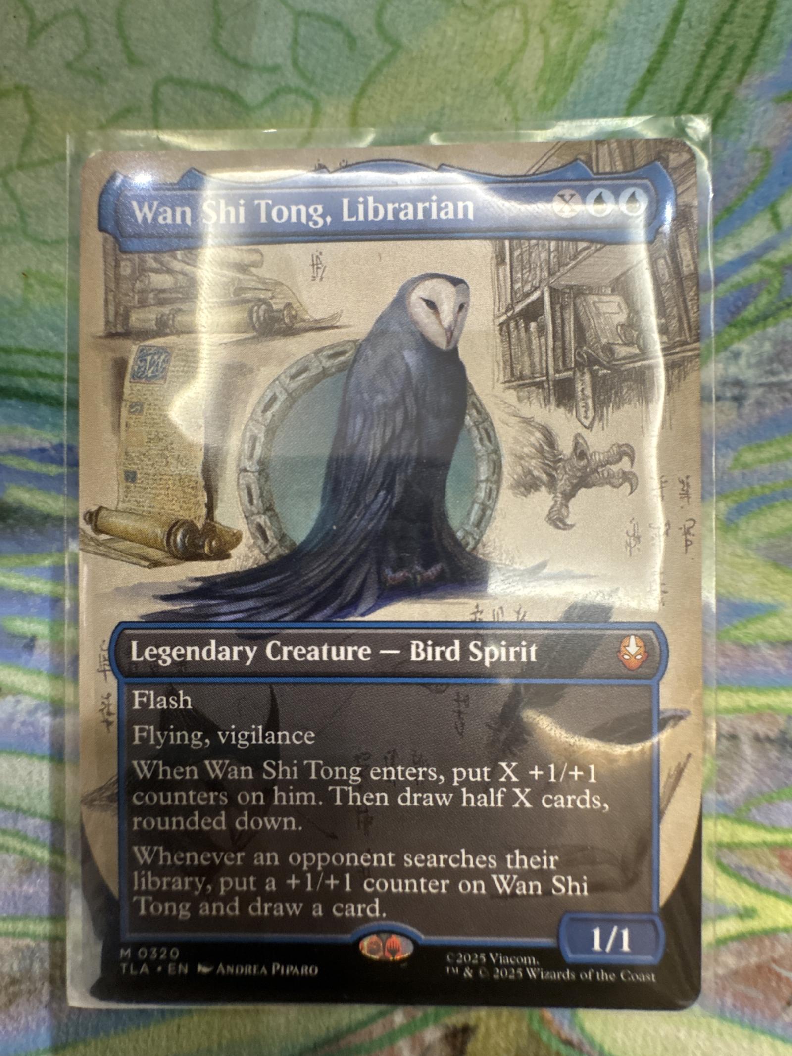 Wan Shi Tong, Librarian is a Legendary Creature - Bird Spirit from the 2023 Magic The Gathering set. Illustrated by Andrea Piparo. This card features flash, flying, and vigilance abilities and interacts with library searching effects. It is playable in various formats due to its strong synergy and unique mechanics. The card is non foil.