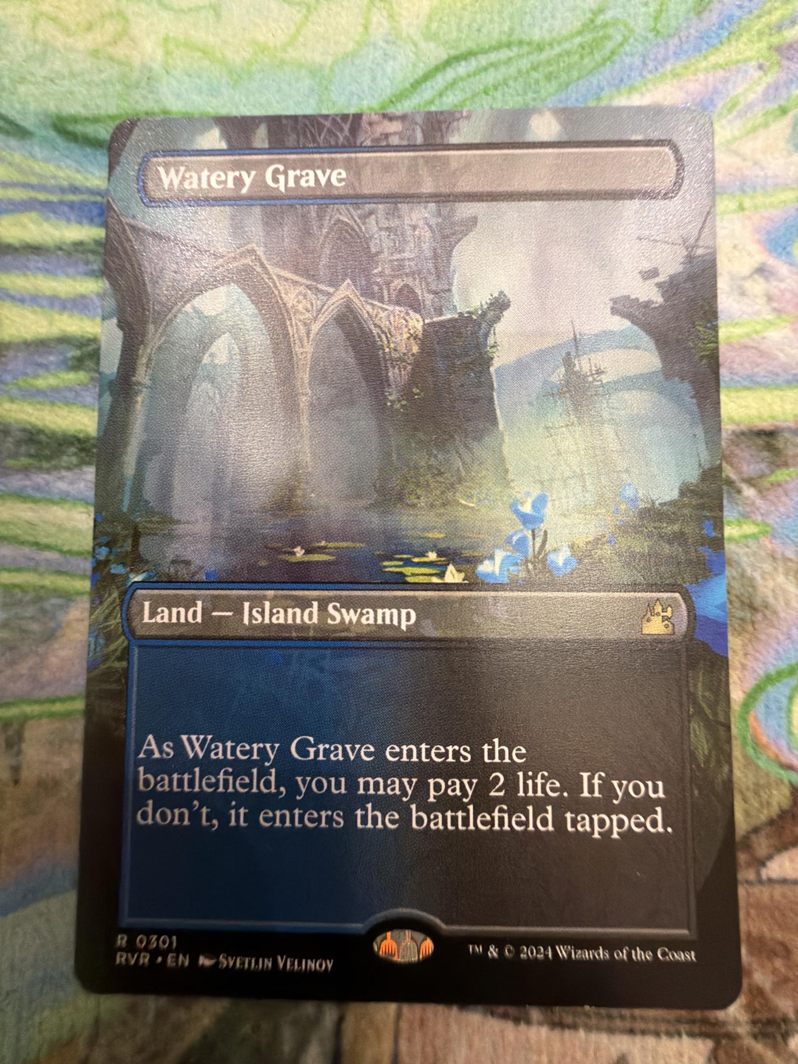 Watery Grave from the Ravnica Valor (RVR) set. Illustrated by Svetlin Velinov. This rare land card allows you to pay 2 life to have it enter untapped. The card is normal printing and is playable in many Magic: The Gathering formats due to its dual land status and importance in blue-black decks.