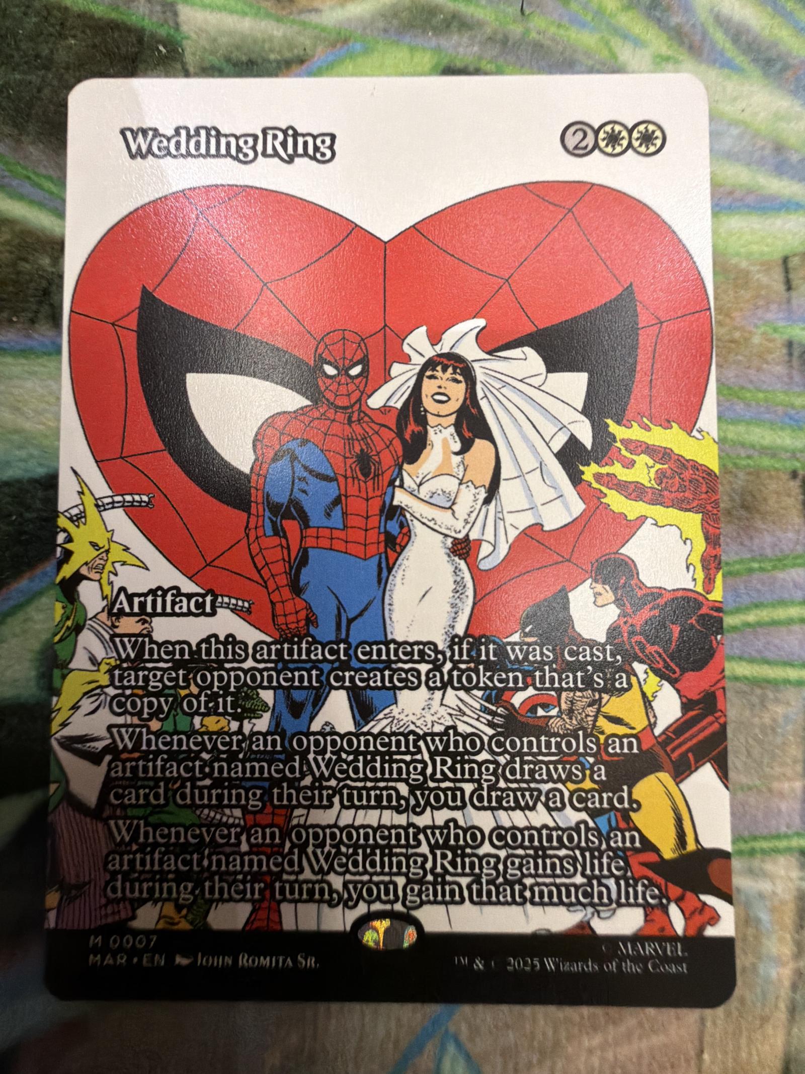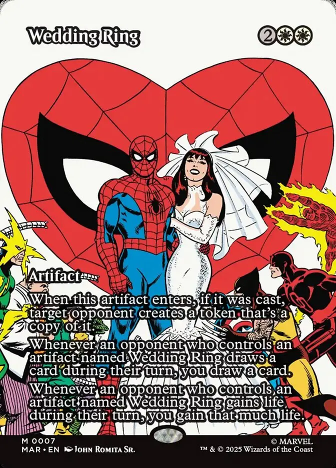 Wedding Ring is an artifact card from the Marvel SPM set of Magic The Gathering, illustrated by John Romita Sr. The card features a unique Spider-Man themed artwork. This card is collectible and not commonly used in the meta. It is a normal printing. Card number 7 from the set.