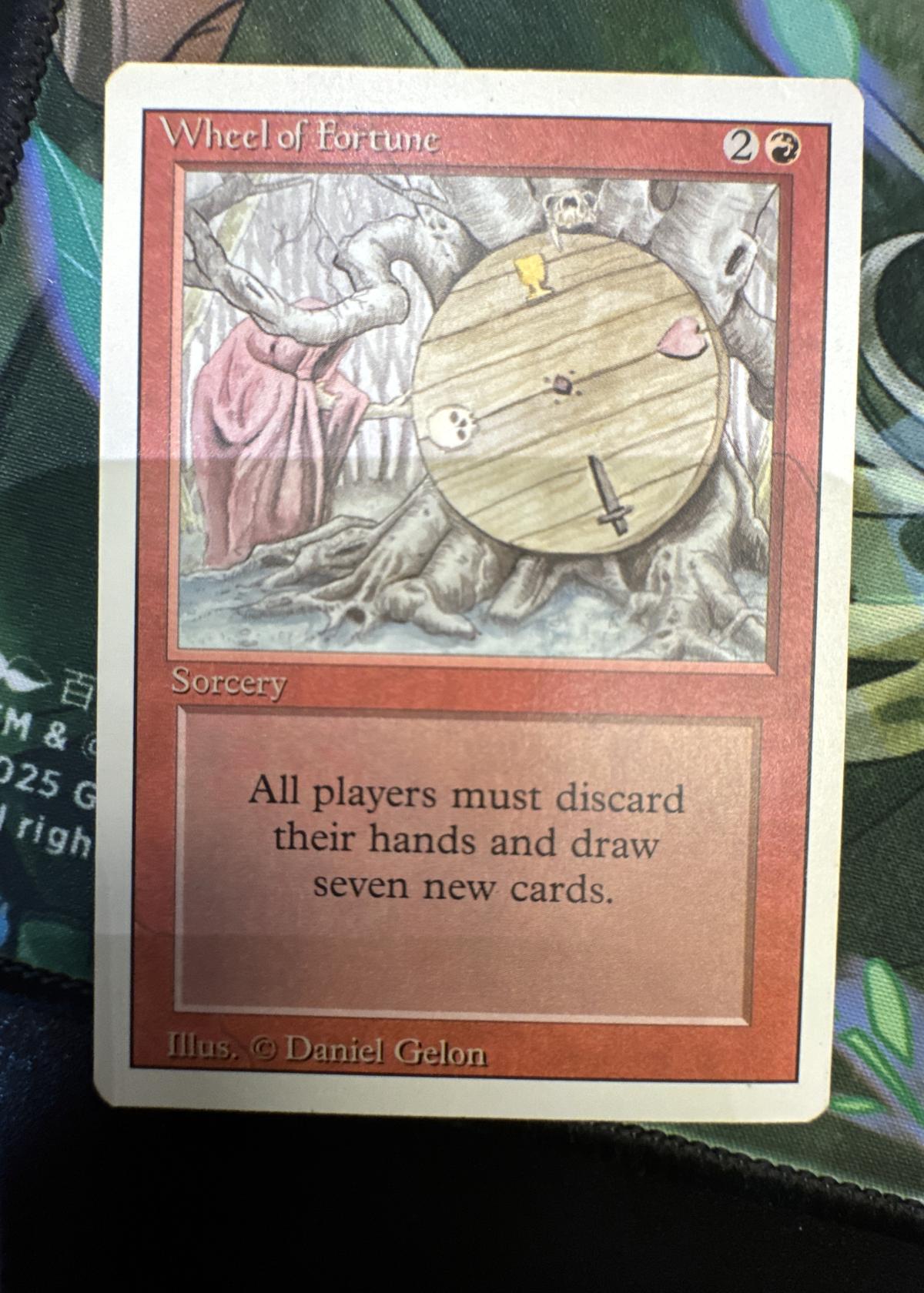 Wheel of Fortune is a classic Magic: The Gathering card illustrated by Daniel Gelon. This iconic sorcery forces all players to discard their hands and draw seven new cards, making it highly desirable for both collectors and competitive Commander (EDH) players. This version appears to be from the early sets (likely Revised or Unlimited) and features the standard printing, not foil. Wheel of Fortune is currently banned in most competitive constructed Magic formats, but it remains a sought-after card in formats that allow it and as a collectible item due to its power and nostalgia.