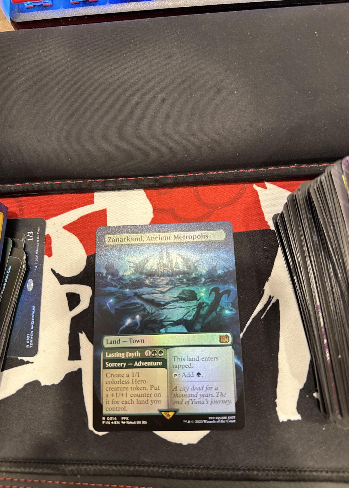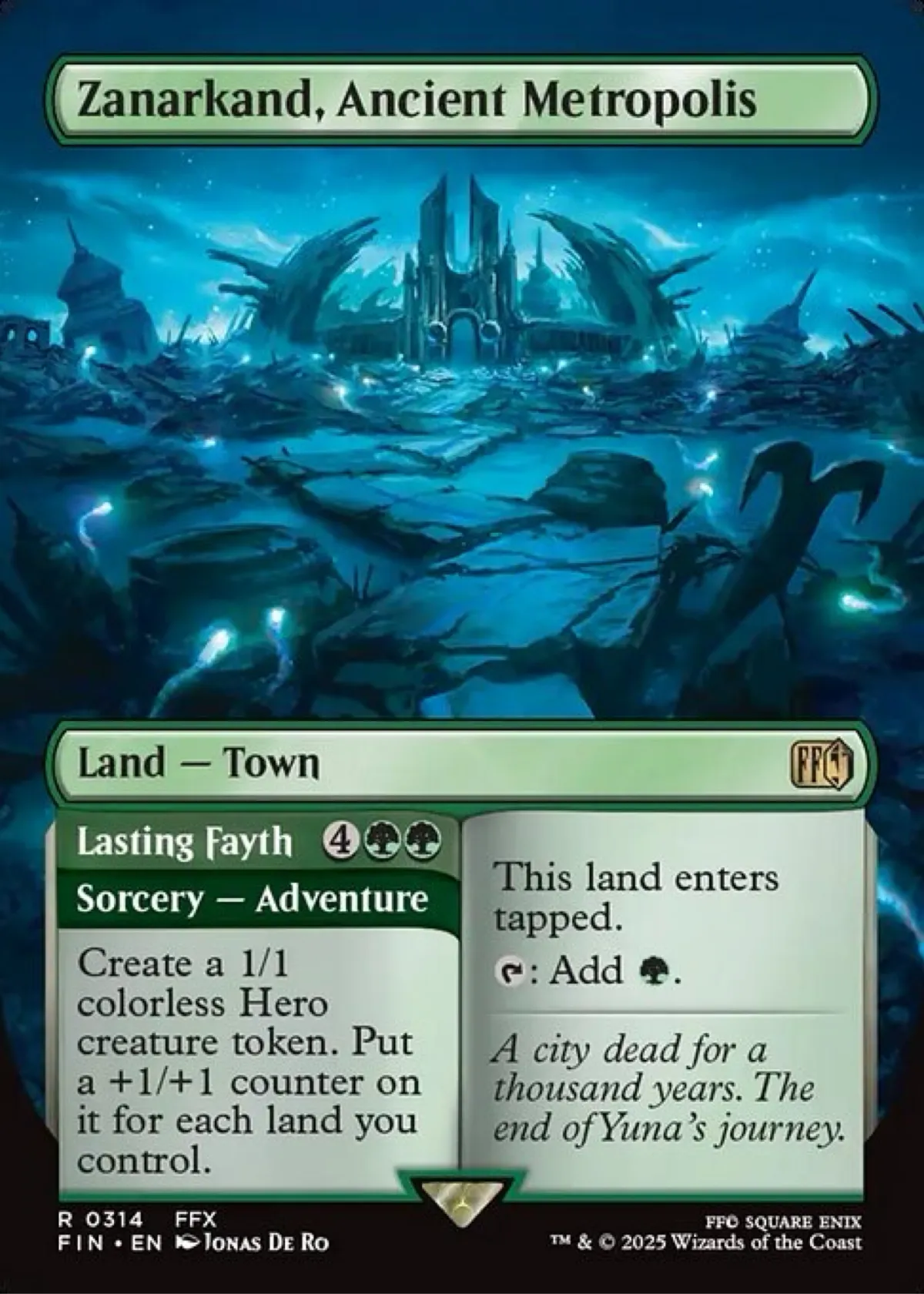 Zanarkand, Ancient Metropolis is a foil Magic: The Gathering card from the Universes Beyond: Final Fantasy set. The card features art by Jonas De Ro and can be identified by card number 314 and set code FFX. It is a specialty land card with an adventure mechanic, making it both playable and collectible, especially for fans of Final Fantasy. The card is in English and is printed in foil.