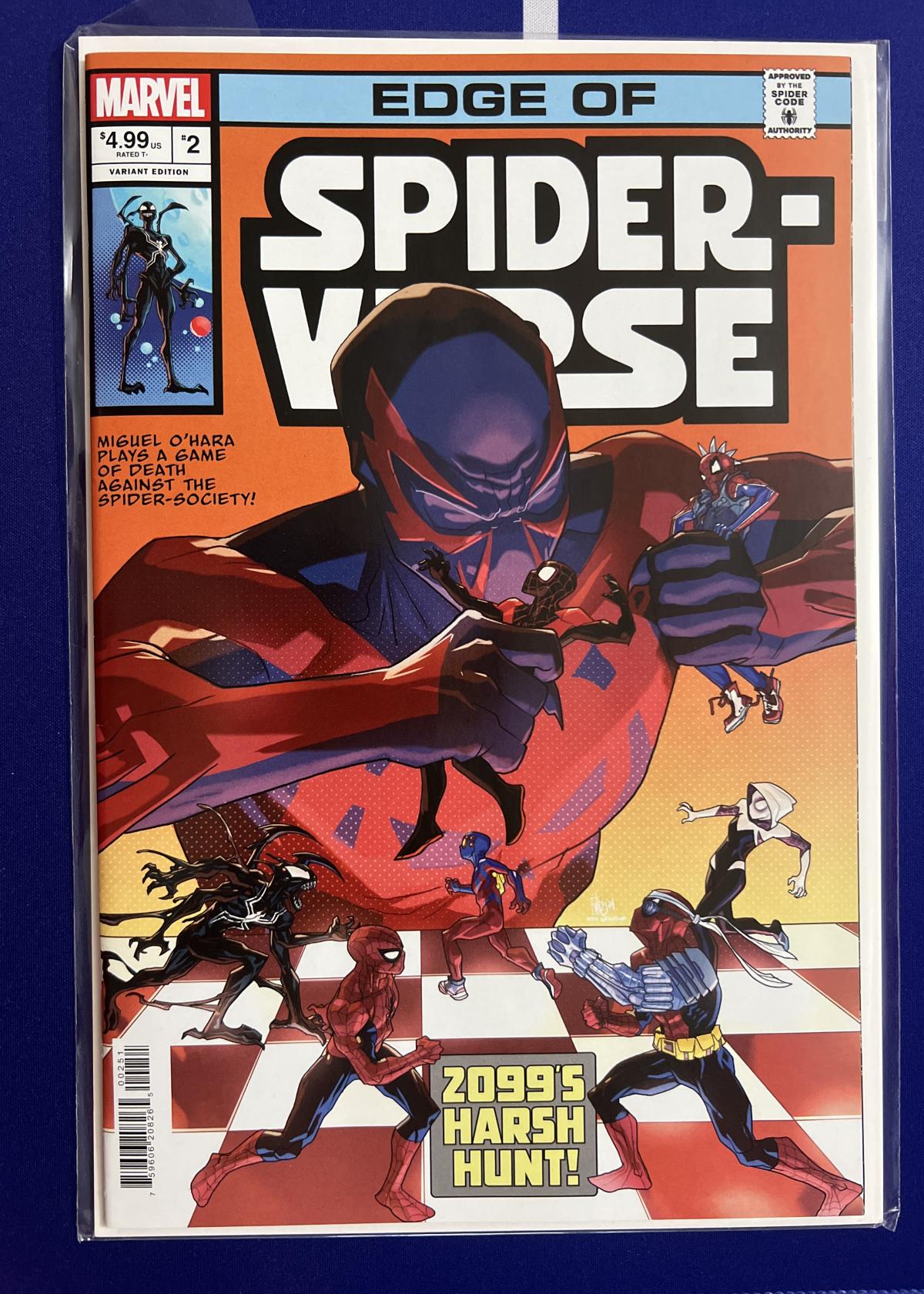 This is the Variant Edition of 'Edge of Spider-Verse' issue #2, featuring stunning cover art that showcases Miguel O'Hara (Spider-Man 2099) engaged in a high-stakes game against members of the Spider-Society. The cover illustration is by artist BJorn Barends. The comic promises a story filled with action and suspense, as Spider-Man 2099 faces peril in '2099's Harsh Hunt!' This edition may appeal to fans of Spider-verse characters and collectors of variant covers. Not graded or slabbed.