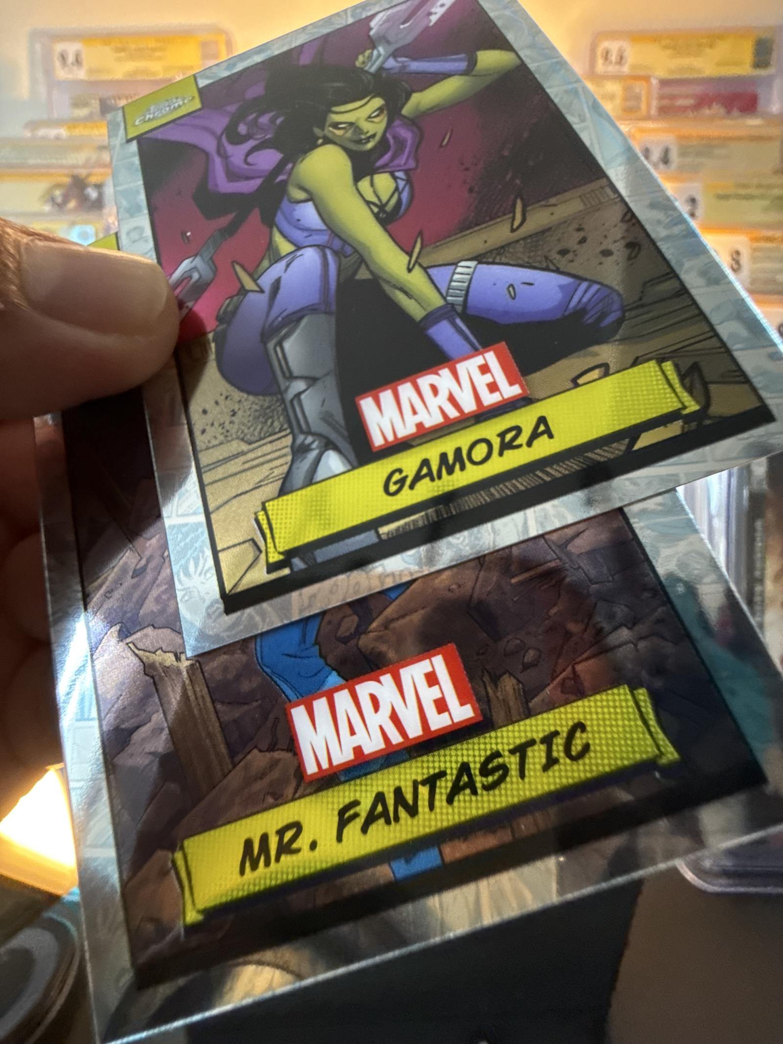 A set of Marvel trading cards featuring Gamora and Mr. Fantastic from modern comics. Cards have vibrant colors and clear artwork. Suitable for collectors and fans of Marvel characters.