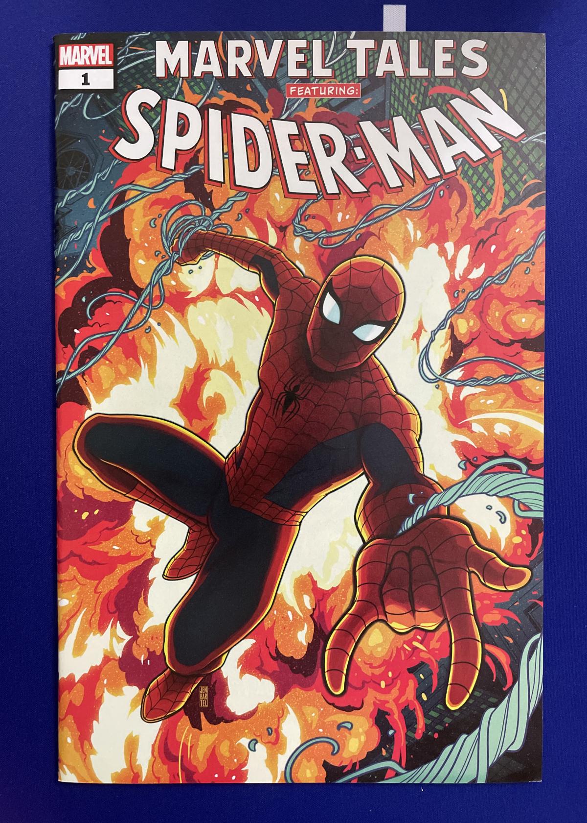This is Marvel Tales Featuring Spider-Man issue #1, published by Marvel Comics. The striking cover art, created by Jen Bartel, features Spider-Man swinging heroically with an explosive backdrop. Jen Bartel is known for her vibrant and dynamic art style, which really stands out on this issue. This comic is not graded or slabbed. A great collectible for Spider-Man fans and Marvel collectors.