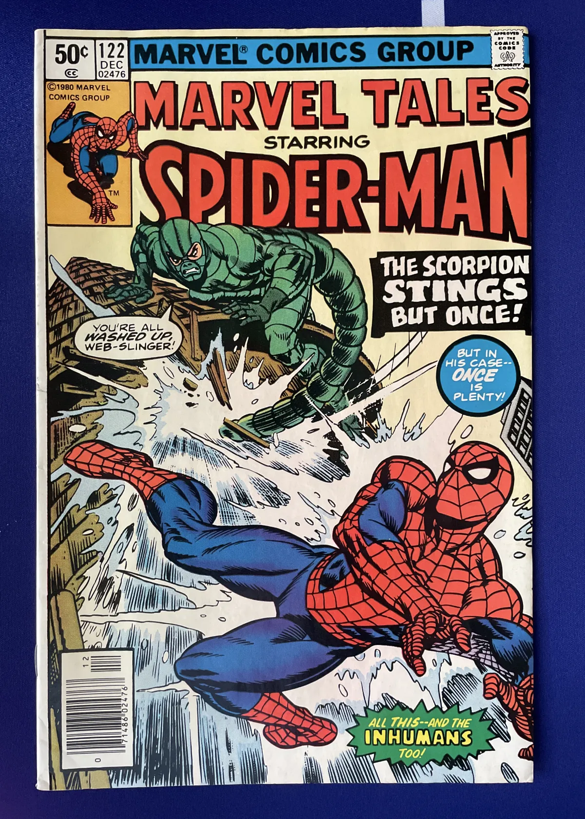 This raw, ungraded copy of Marvel Tales Starring Spider-Man issue #122 from 1980 features iconic cover art by John Romita Sr., depicting Spider-Man in a dynamic clash with the Scorpion under the tagline 'The Scorpion Stings But Once!'. This Bronze Age comic includes an additional story featuring the Inhumans, adding extra appeal for collectors and fans of classic Marvel narratives.