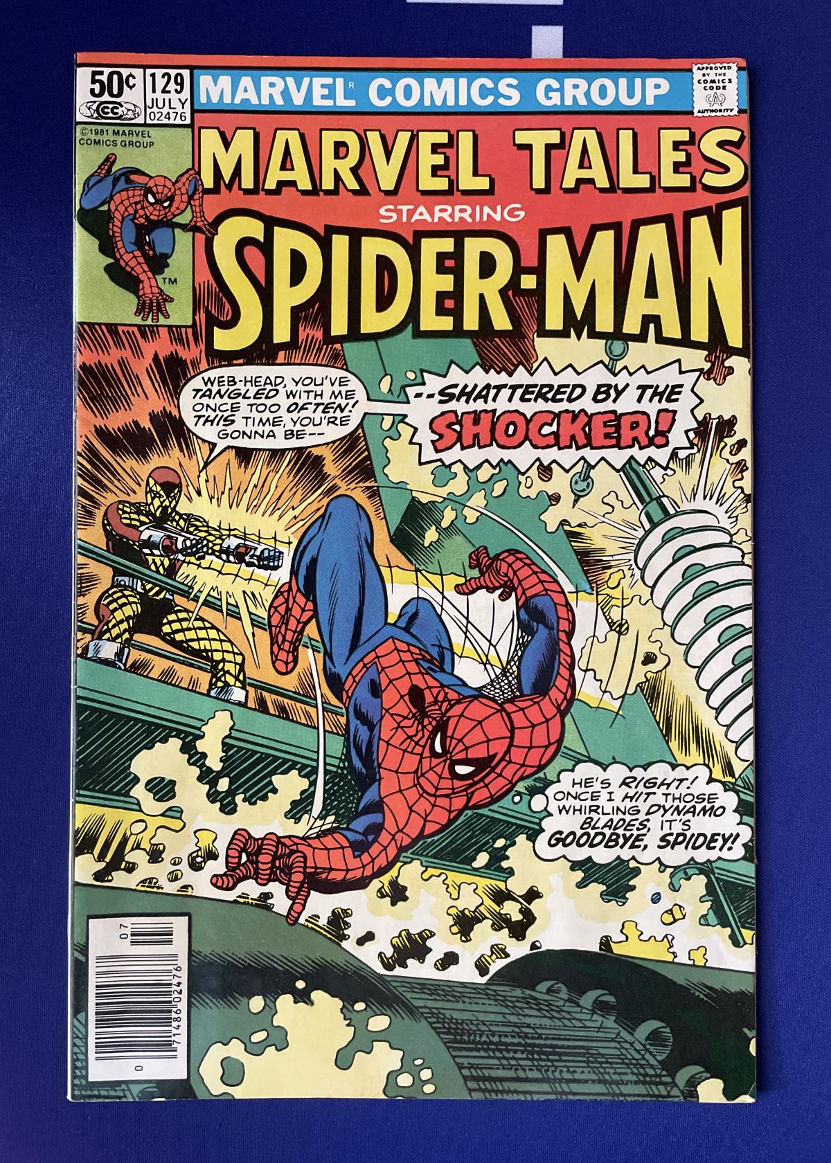 This is Marvel Tales Starring Spider-Man issue #129, published in July 1981 by Marvel Comics Group. The cover features dynamic artwork with Spider-Man facing off against the Shocker. The iconic cover art was illustrated by legendary artist John Romita Sr., known for his influential work on Spider-Man throughout the Silver and Bronze Ages. Notably, this issue recreates early Spider-Man tales, making it a key collectible for Spidey fans. The comic is not slabbed or graded as shown in the image.