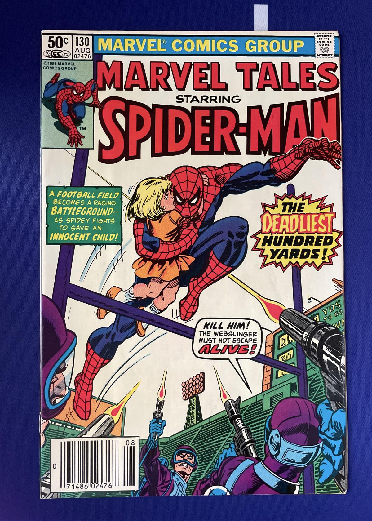 This is 'Marvel Tales Starring Spider-Man' issue #130, published in August 1981 by Marvel Comics. The dynamic cover art features Spider-Man rescuing a child from danger on a football field turned battleground, highlighted by the dramatic tagline 'The Deadliest Hundred Yards!' The artwork on the cover is illustrated by legendary artist John Romita Sr., known for his iconic work on Spider-Man titles. This issue stands out as it reprints classic Spider-Man stories, providing fans with nostalgic tales and Silver/Bronze Age Marvel storytelling. The comic is not graded or slabbed. A collectible for any Spider-Man fan.