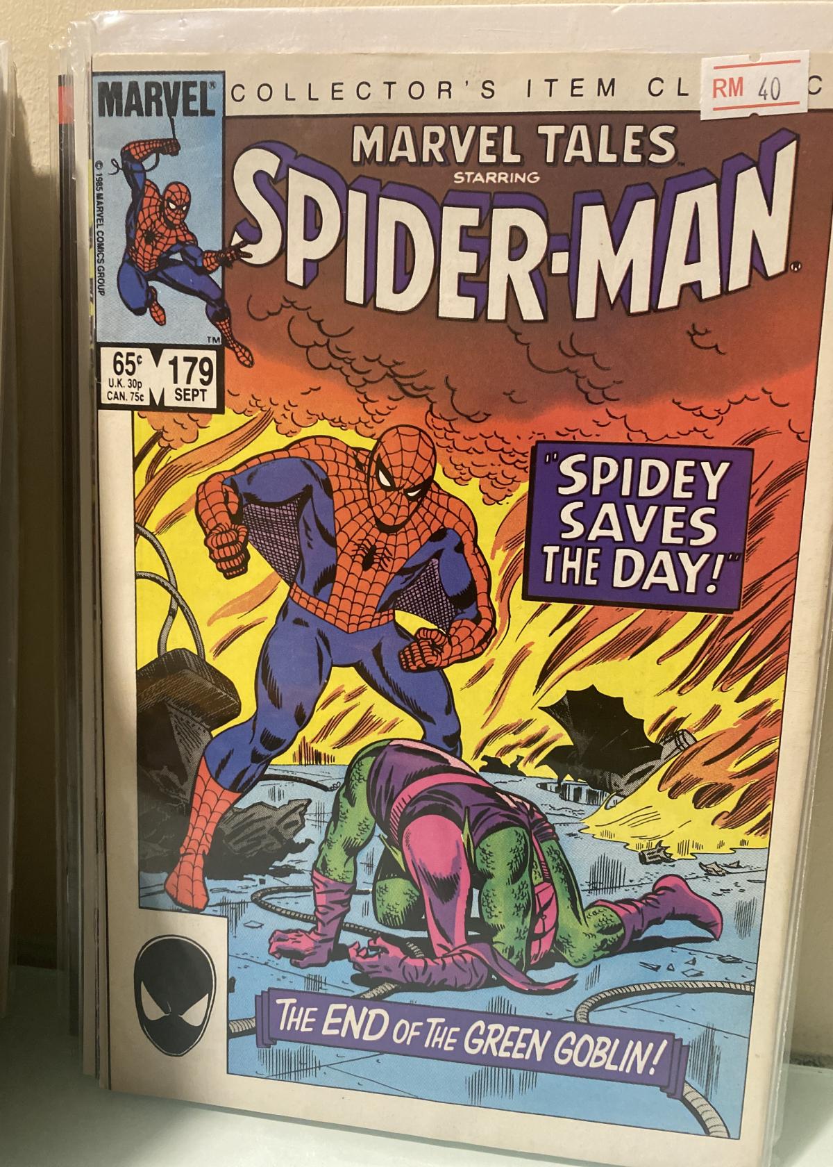 This raw, ungraded copy of Marvel Tales Starring Spider-Man #179 from 1985 features an iconic showdown between Spider-Man and the Green Goblin, titled 'Spidey Saves The Day!' and 'The End of the Green Goblin!'. The cover art, likely by legendary Spider-Man artist John Romita Sr., captures dramatic action with burning destruction in the background, emphasizing a pivotal moment in Spider-Man lore.