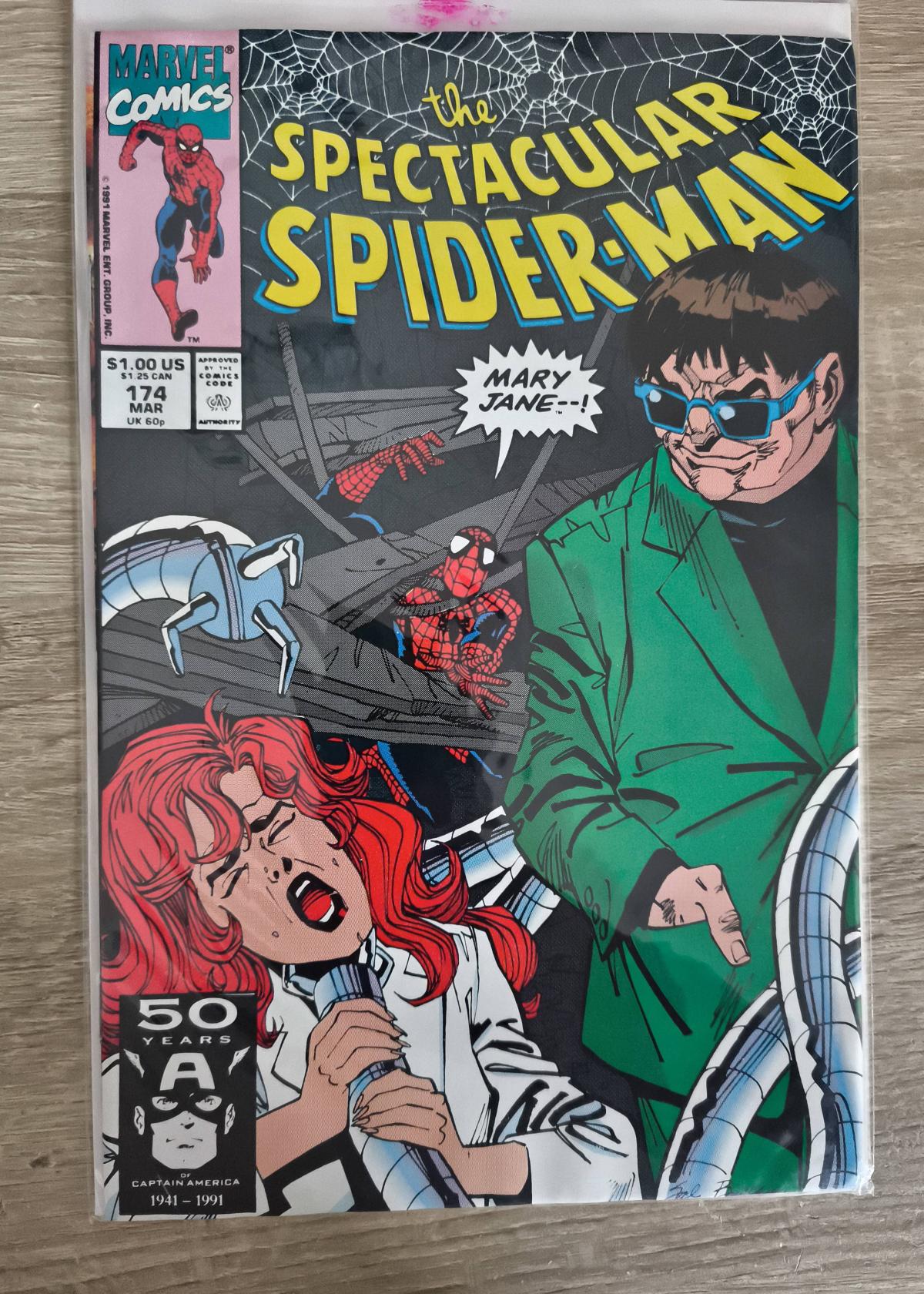 This issue of 'The Spectacular Spider-Man' features a dramatic cover by Sal Buscema, depicting Spider-Man, Mary Jane, and Doctor Octopus. Published in March 1991, it celebrates the 50th Anniversary of Captain America (1941–1991). The storyline involves intense interactions between Spider-Man and key characters, including Doctor Octopus. The comic is bagged but ungraded and not slabbed.