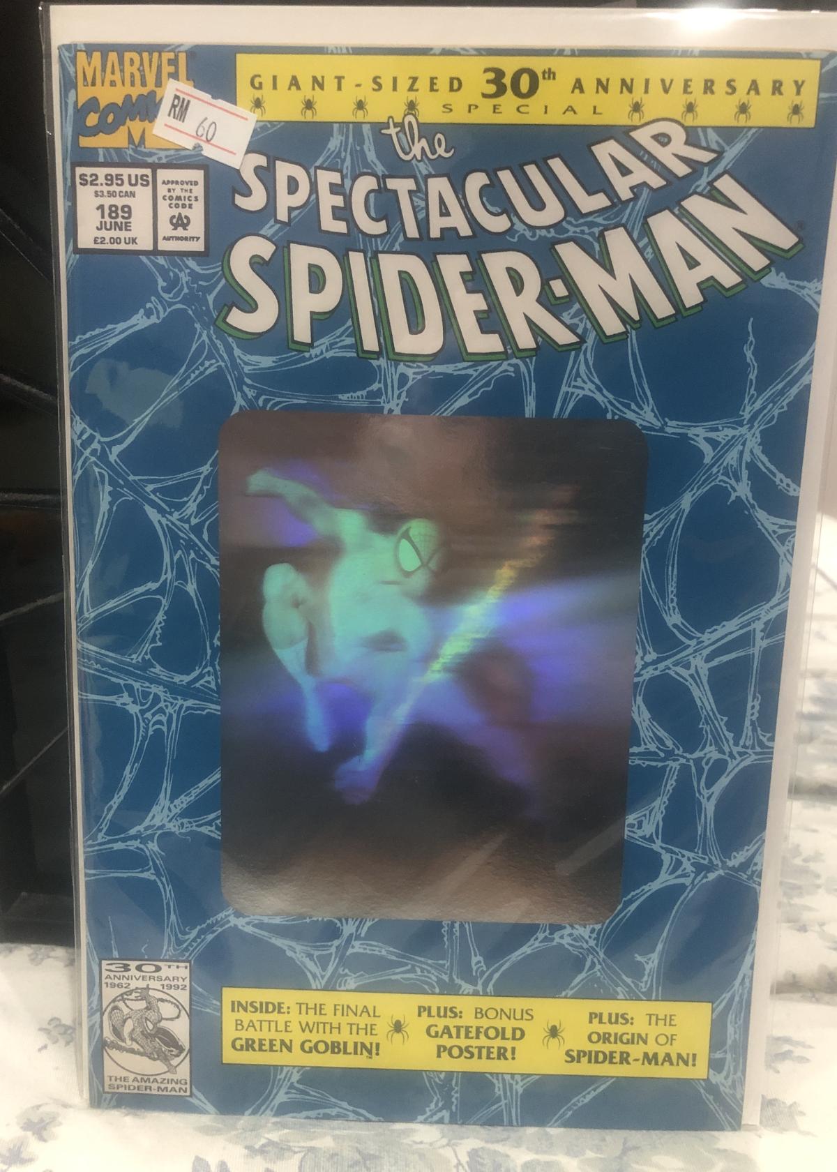 This is the Spectacular Spider-Man #189, a Giant-Sized 30th Anniversary Special edition published by Marvel Comics. The comic features a striking hologram cover art by Sal Buscema and is well known for its lenticular (hologram) cover, making it a highly collectible item. Inside, you'll find the final battle with the Green Goblin, a bonus gatefold poster, and a retelling of the origin of Spider-Man. This item is bagged and boarded, but not professionally graded or slabbed.