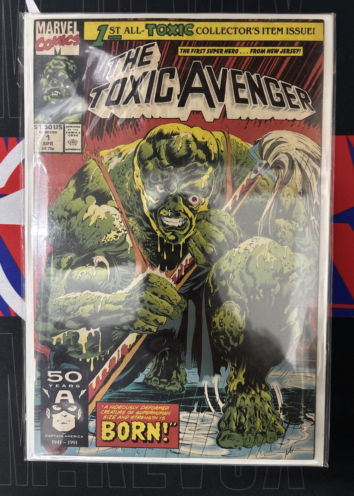 This is the first issue of The Toxic Avenger comic book series, published by Marvel Comics. The cover art is by Rodney Ramos, with a distinctly vibrant and gritty style. Released in April 1991, it features 'the first super hero from New Jersey!'—the Toxic Avenger. This comic celebrates the 50th anniversary of Captain America as noted on the cover. Issue #1 is the first all-toxic collector's item issue and is a must-have for both Marvel and cult classic fans. The book is bagged and boarded for protection, but is not graded or slabbed. A key book for any cult comic collector.