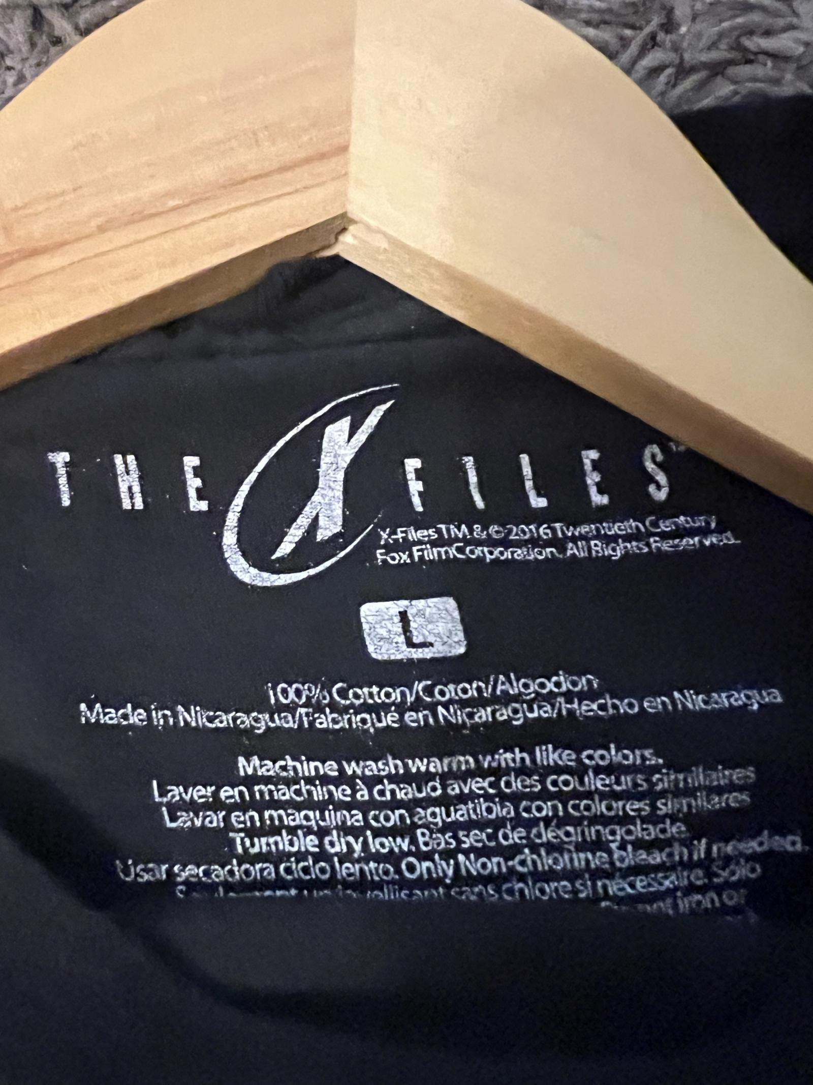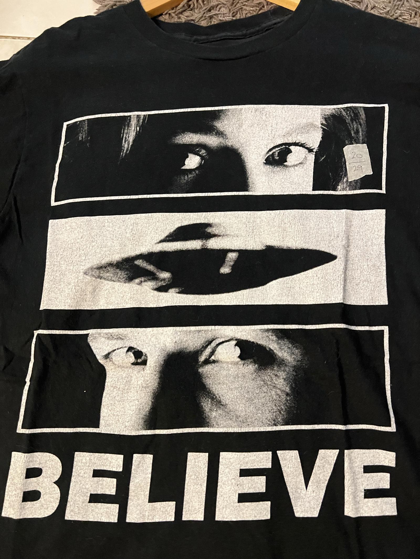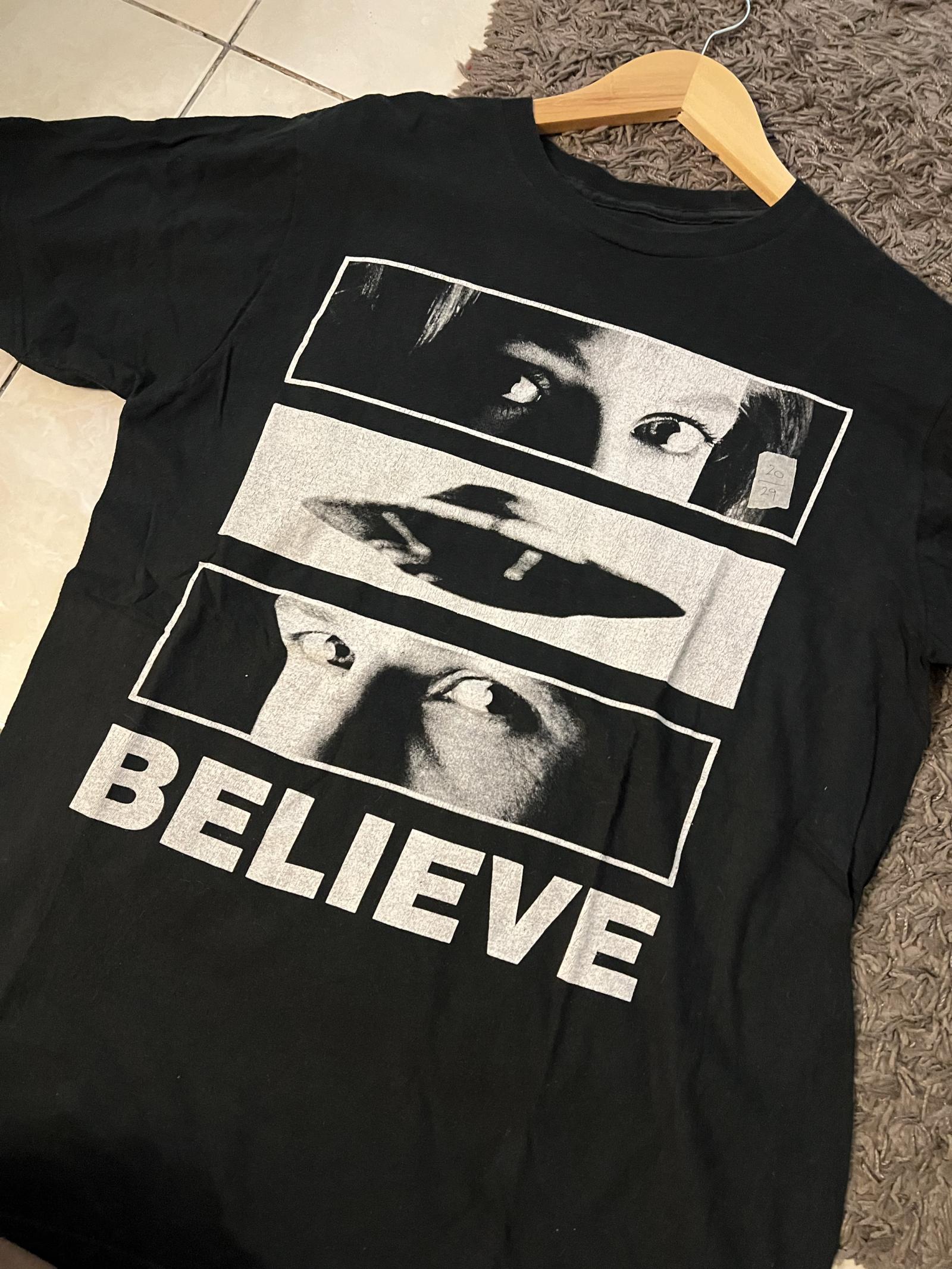 This black men's t-shirt features a striking vintage-style graphic design with three segmented images: two pairs of eyes and a UFO silhouette in the middle, accompanied by the word 'BELIEVE' in bold letters at the bottom. The shirt is made from soft fabric and is perfect for fans of UFO culture and retro graphic tees. Slight signs of wear consistent with previous use but overall intact design.From the movie “The X-Files” pit 20 length 29 inches. Size large.
