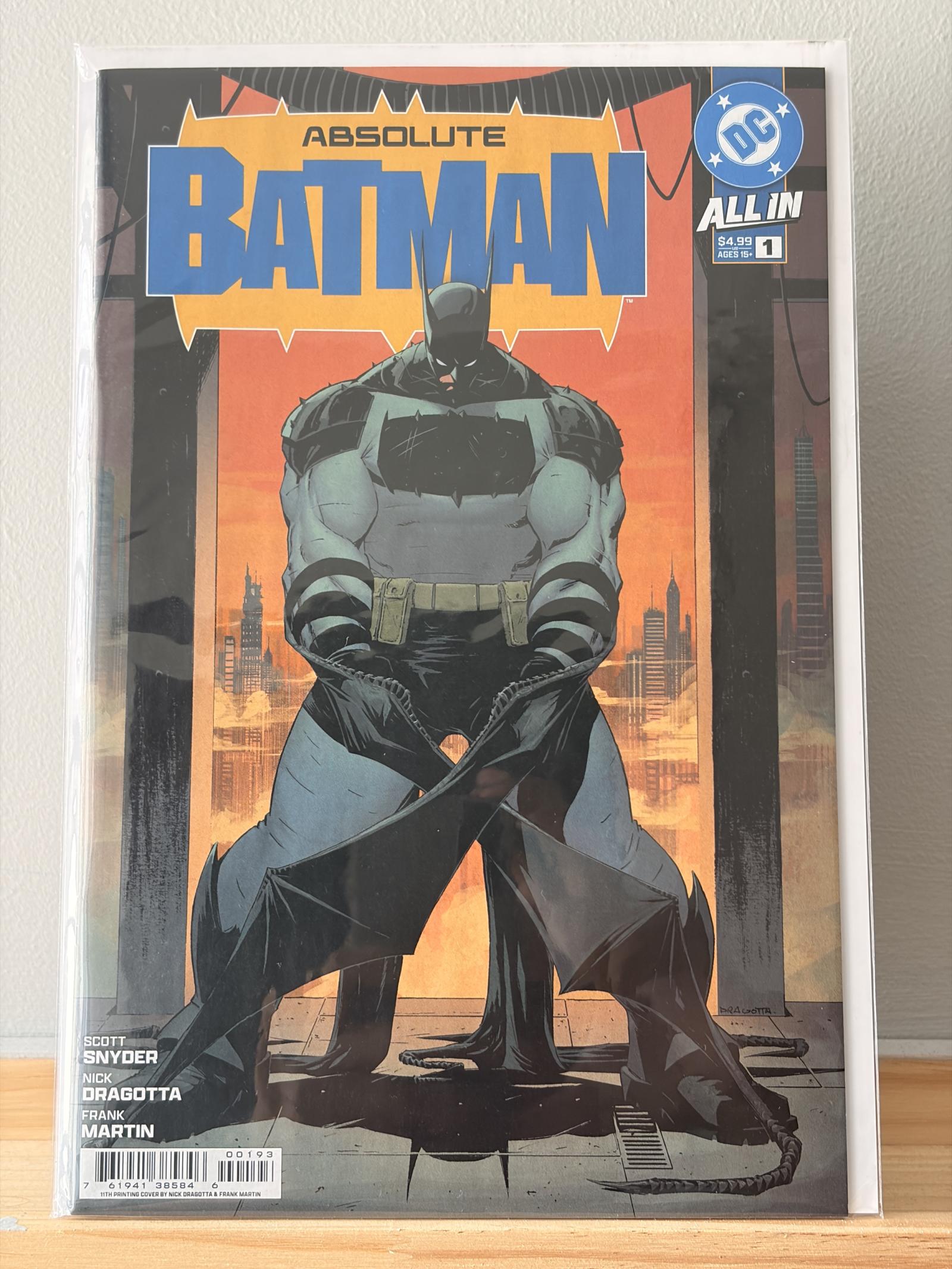 Absolute Batman #1 from DC Comics, featuring artwork by Nick Dragotta and Frank Martin, and story by Scott Snyder. This modern comic showcases a powerful cover image of Batman in a striking pose. A must-have for fans and collectors of contemporary Batman stories and DC Comics.