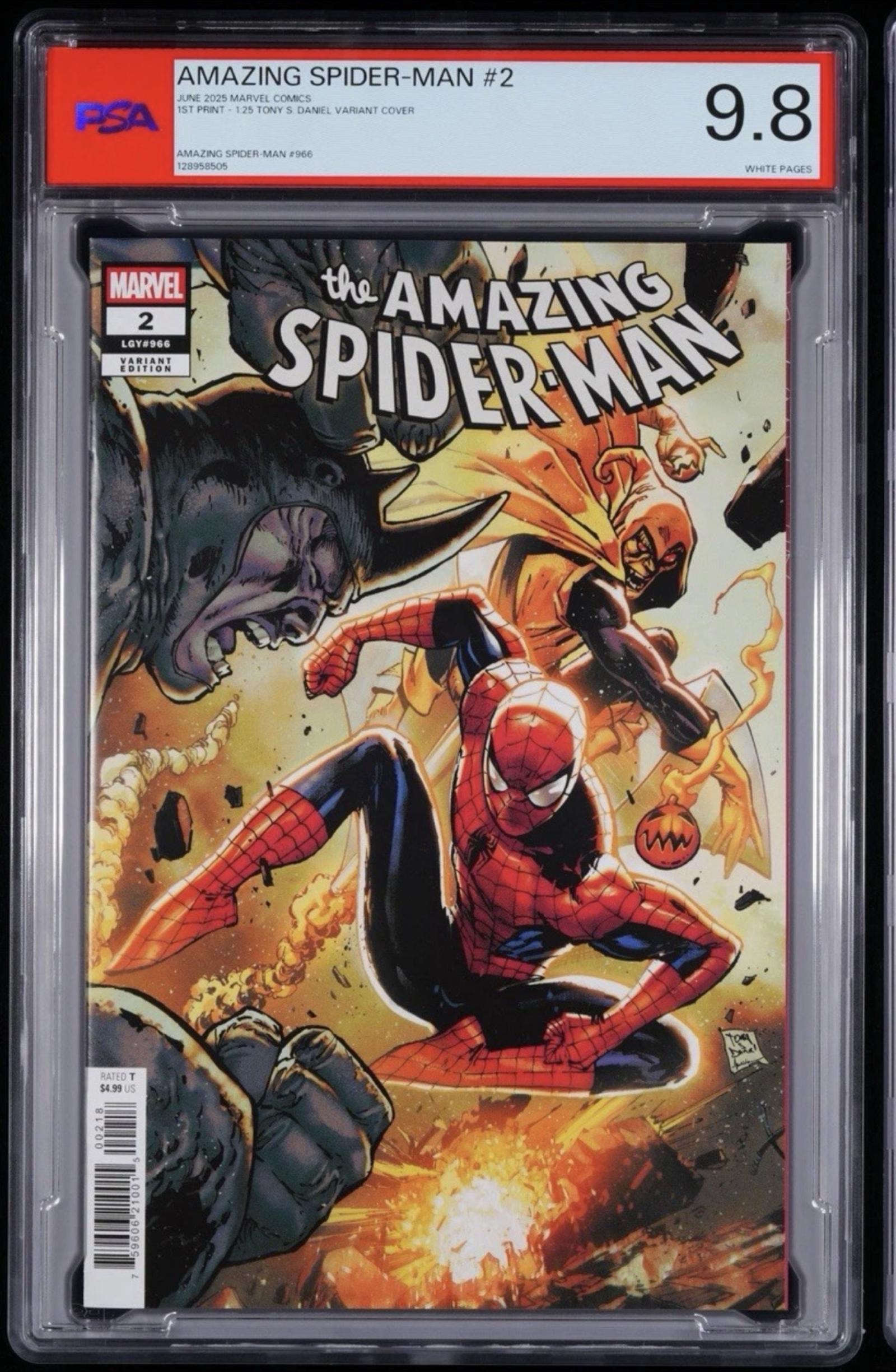 Amazing Spider-Man #2 (June 2025) Marvel Comics, graded PSA 9.8 with white pages. This is the 1st print featuring the 1:25 Tony S Daniel variant cover. A modern comic in near mint condition, perfect for collectors and fans of Spider-Man.