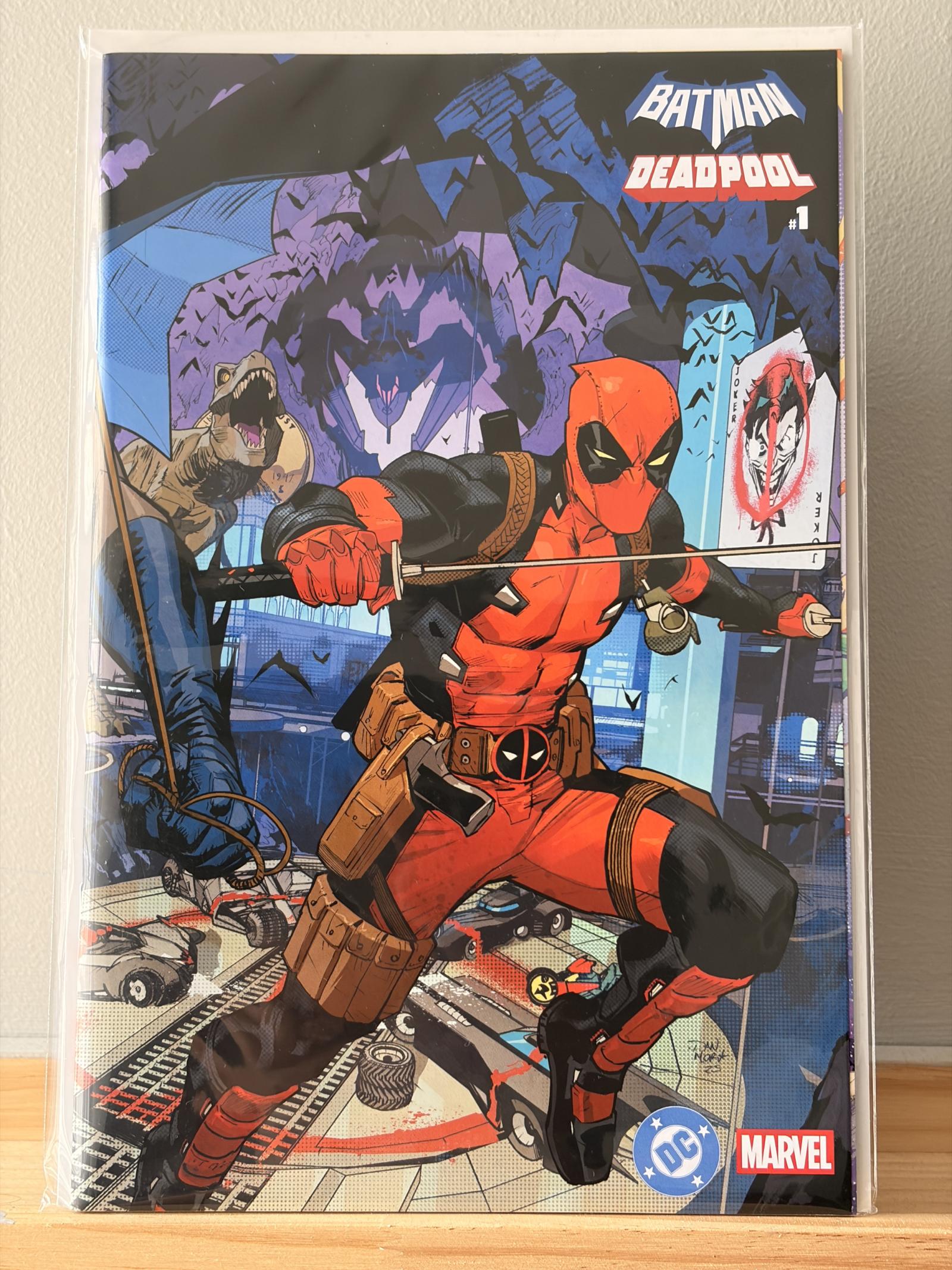 Batman Deadpool #1 comic featuring a unique Marvel and DC crossover with dynamic cover art showcasing Deadpool in action. The comic is bagged and boarded, preserving its quality.