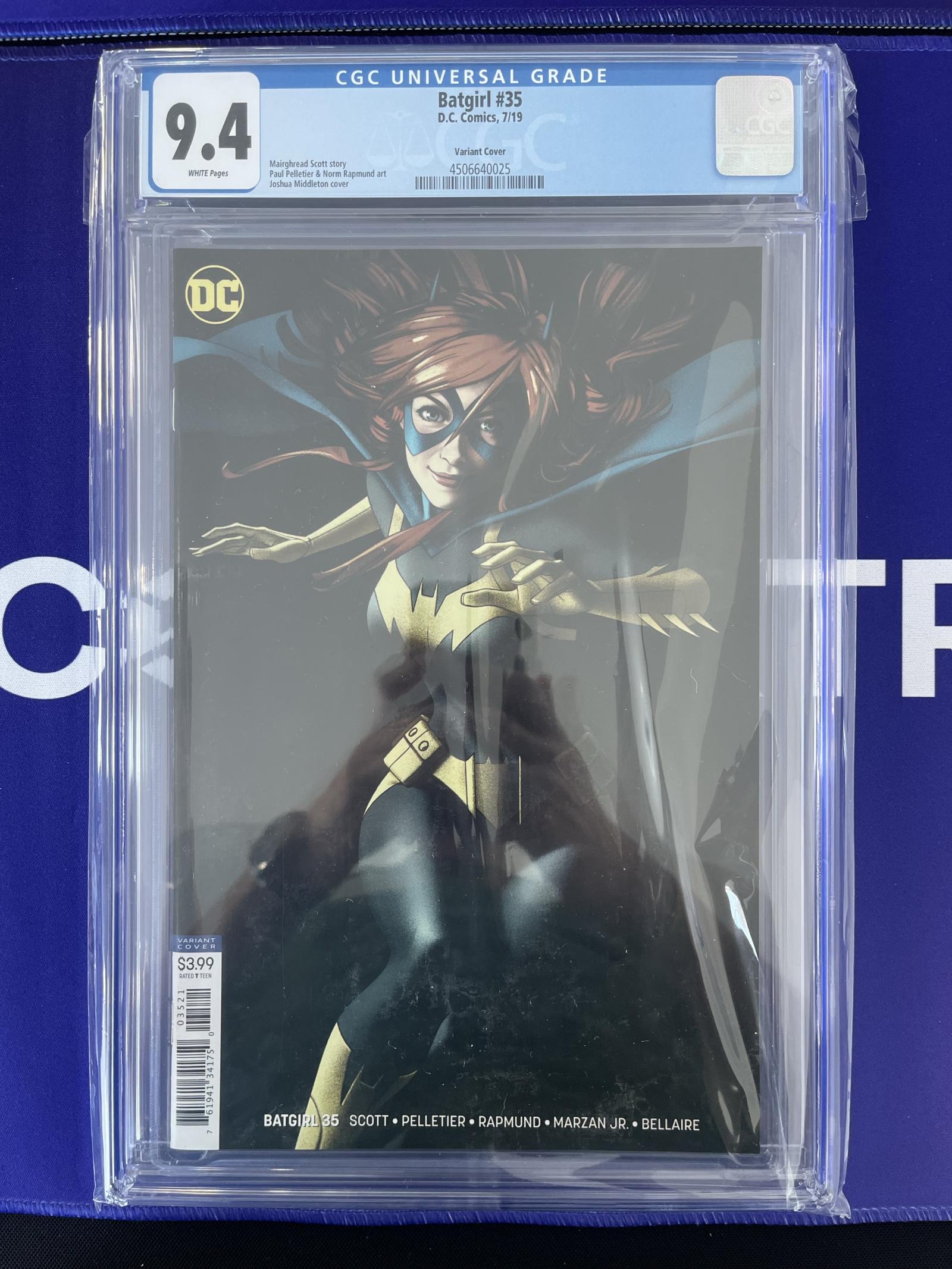 This is a CGC graded 9.4 (Near Mint) copy of Batgirl #35, published by DC Comics in 2019. It features the variant cover art by Joshua Middleton, with story by Mairghread Scott and artwork by Paul Pelletier and Norm Rapmund. The comic is preserved in a protective CGC slab, showcasing its excellent condition with white pages.