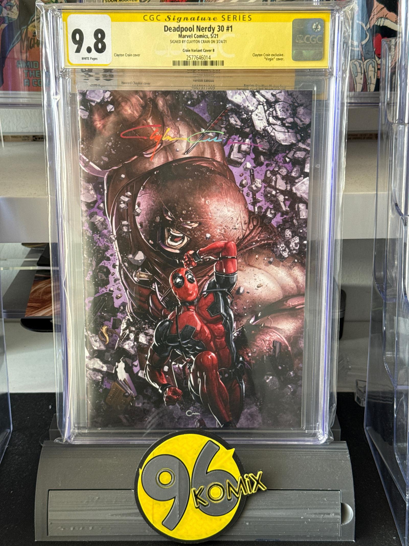 Deadpool Nerdy 30 #1, Marvel Comics May 2021, Crain Variant Cover, CGC Signature Series graded 9.8 with white pages. Signed by artist Clayton Crain on 3/24/21. Classic Deadpool action artwork with exclusive "Virgin" cover. A highly collectible modern comic in near mint condition, perfect for Deadpool fans and collectors.